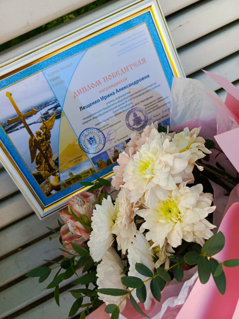 «Благодарю Ирину Александровну Лещенко за большой вклад в духовно-нравственное воспитание наших детей! Талантливый учитель уже четверть века работает в школе № 429 имени Героя России М.Ю. Малофеева. Под её руководством воплощаются в жизнь творческие проекты по краеведению, истории, профориентации. На протяжении многих лет ученики педагога – постоянные победители и призеры многих районных, городских, региональных, всероссийских и международных олимпиад, конкурсов, конференций», — написал на своей странице глава Петродворцового района Александр Якушев.