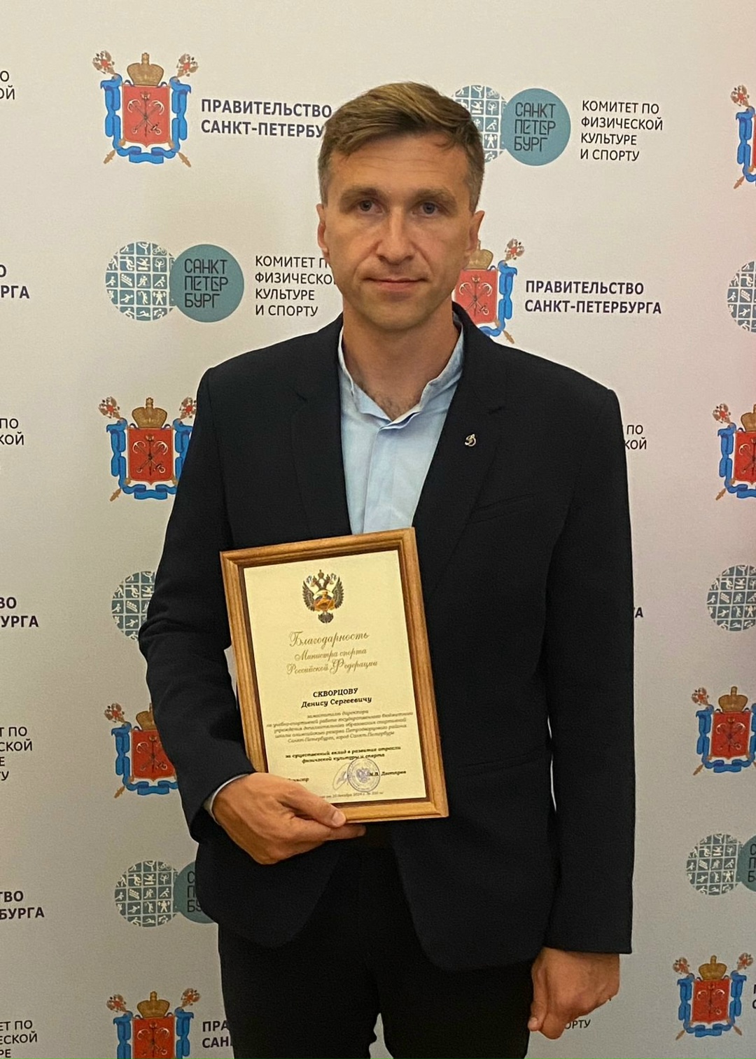 Благодарностью Министерства спорта России отмечен труд Дениса Скворцова — заместителя директора по учебно-спортивной работе СШОР, подведомственной администрации Петродворцового района.