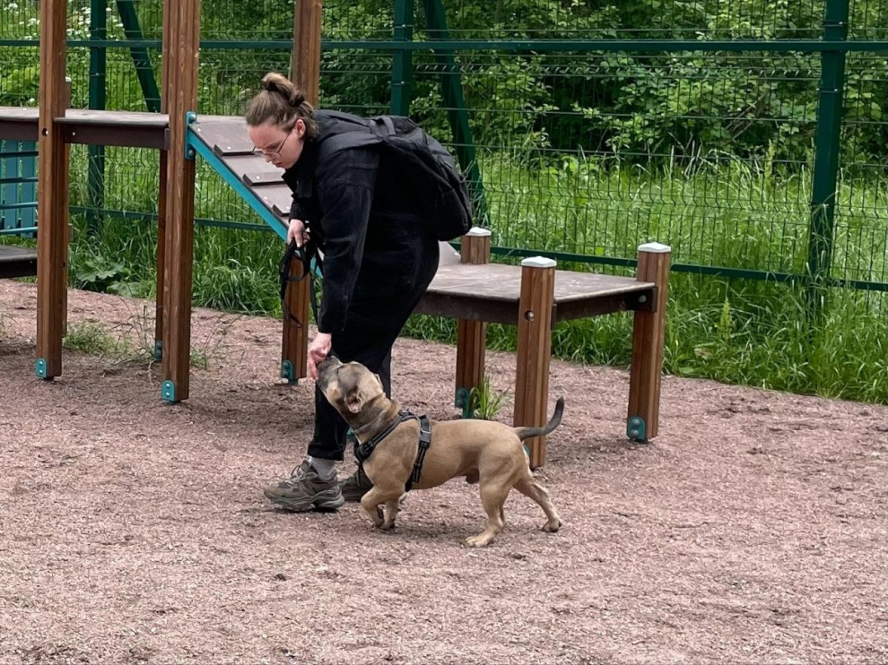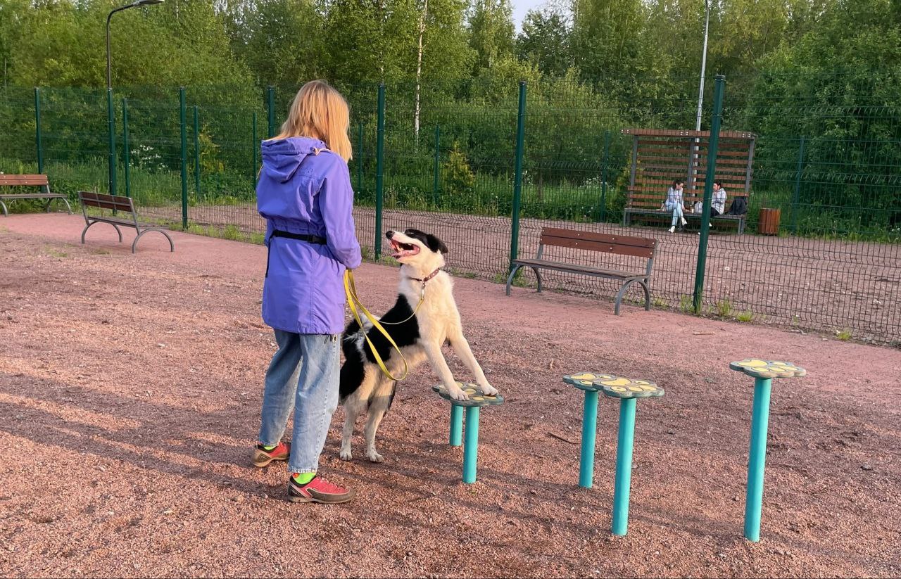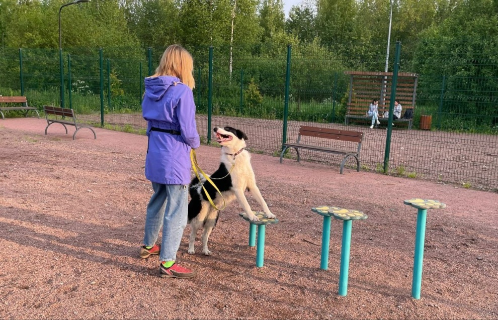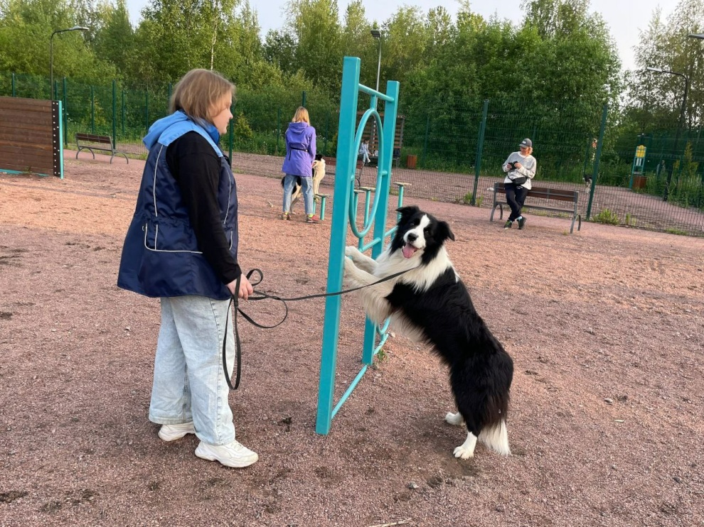 Специалист подростково-молодёжного клуба «Экватор» проводит занятия на площадке для выгула и дрессировки собак в Старом Петергофе, на пересечении улицы Халтурина и Бобыльской дороги. Она была создана по программе «Формирование комфортной городской среды» в 2022 году, а в прошлом году по той же программе такие площадки появились в Стрельне и Ломоносове.