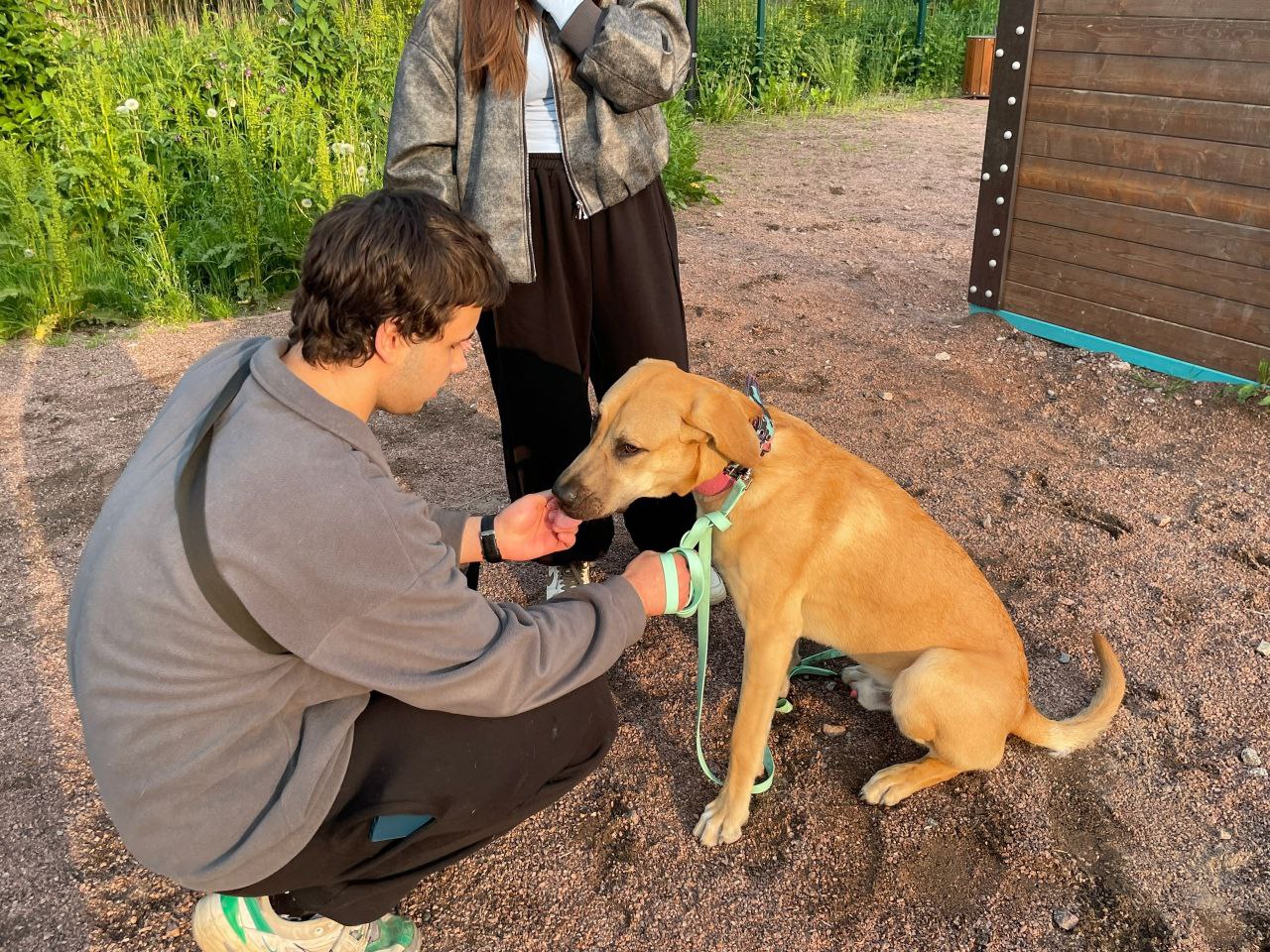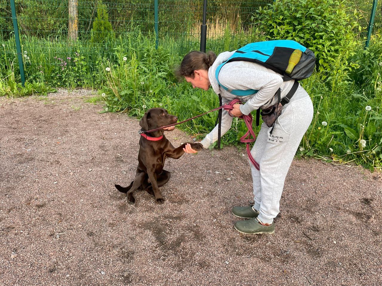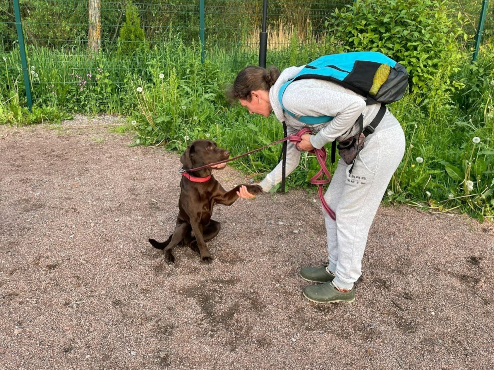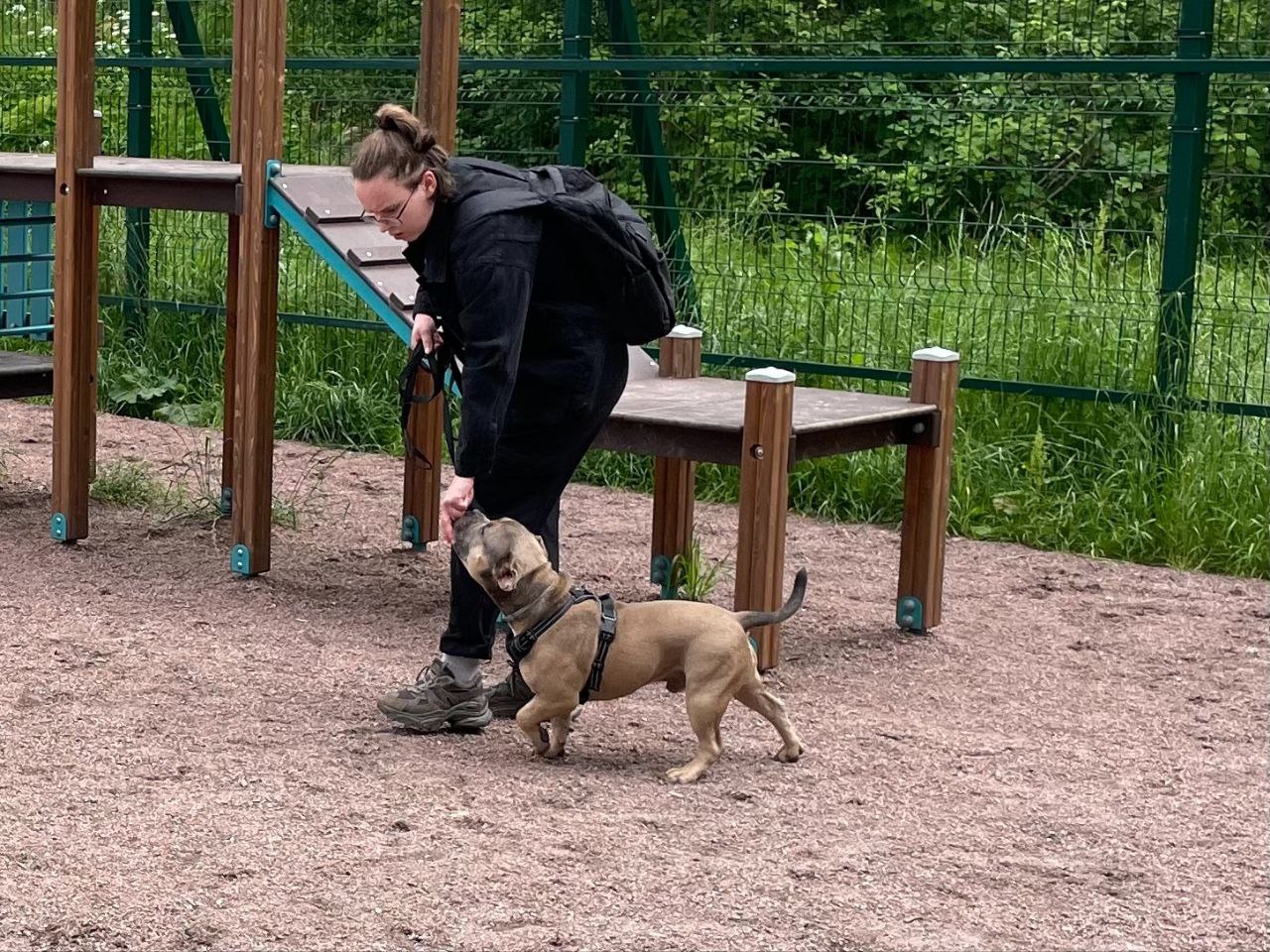 Специалист подростково-молодёжного клуба «Экватор» проводит занятия на площадке для выгула и дрессировки собак в Старом Петергофе, на пересечении улицы Халтурина и Бобыльской дороги. Она была создана по программе «Формирование комфортной городской среды» в 2022 году, а в прошлом году по той же программе такие площадки появились в Стрельне и Ломоносове.