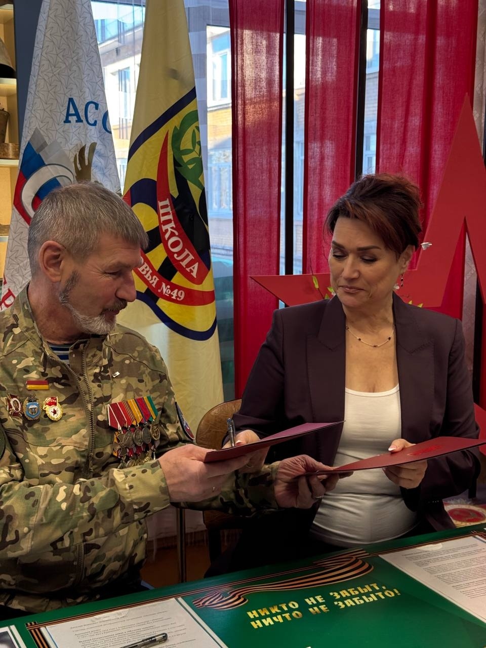 Рядом со школой, на Санкт‑Петербургском шоссе, 96, открывается штаб районного отделения ассоциации, где ребята смогут учиться плести маскировочные сети, проводить мероприятия и благотворительные акции и общаться с ветеранами на «Уроках мужества». Инициатором встречи стал выпускник 49-й школы, герой СВО и кавалер двух медалей «За отвагу» — Алексей Сергеевич Герасимов. Человек, который делом доказал преданность Родине, вернулся в родные стены, чтобы помогать растить новое поколение.
