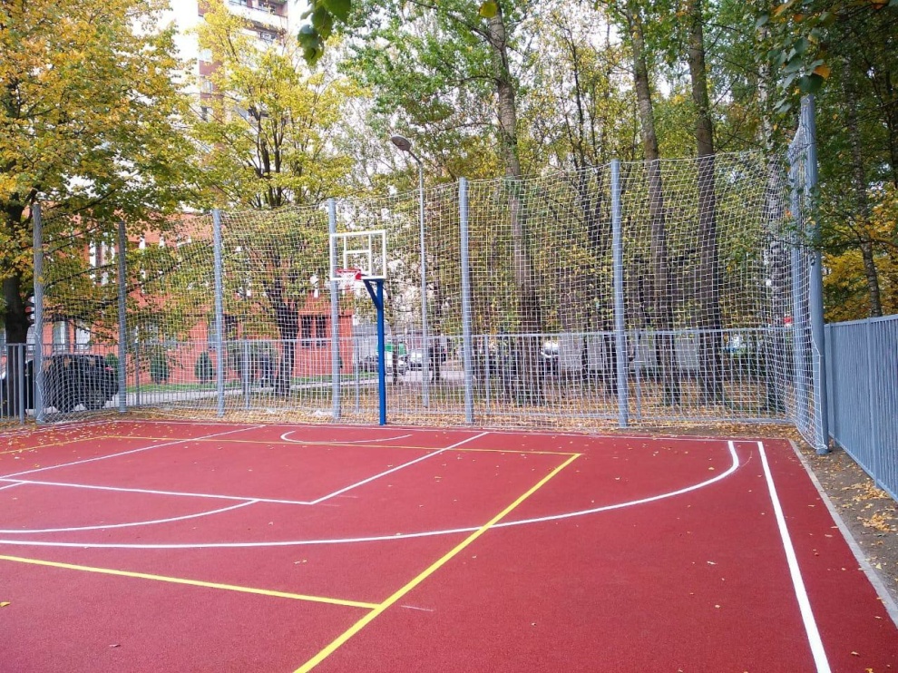 Согласно проекту на спортивной площадке установлены баскетбольные антивандальные стойки, универсальная стойка для игры в волейбол и бадминтон с плавной регулировкой высоты сетки.