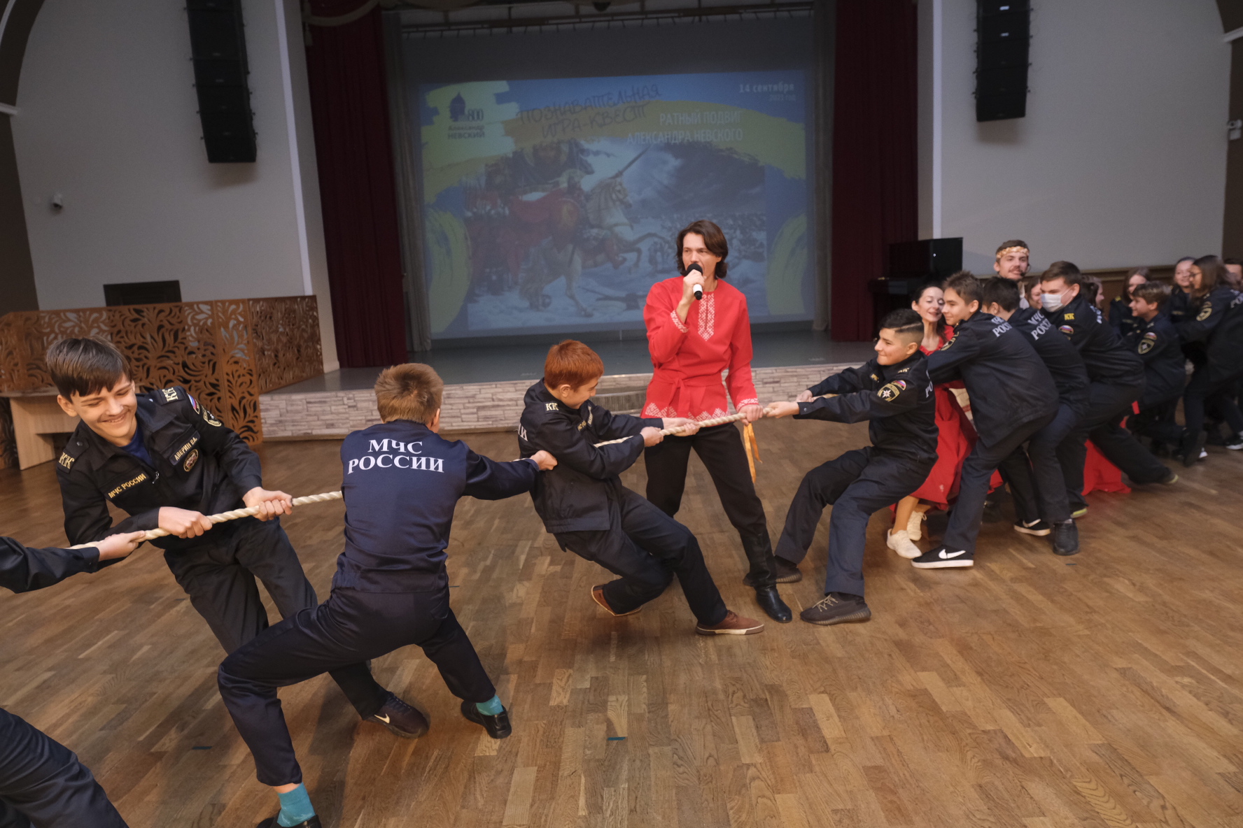 Затем юных гостей пригласили поучаствовать в молодецких забавах. Ведь на Руси мальчиков учили военному делу, потому что владеть оружием с ранних лет было очень важным. Поделившись на две команды, школьники перетягивали канат, использовали катапульту из шапок и «защищали свои земли» от чужаков.