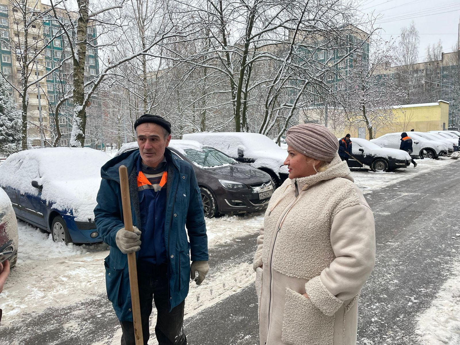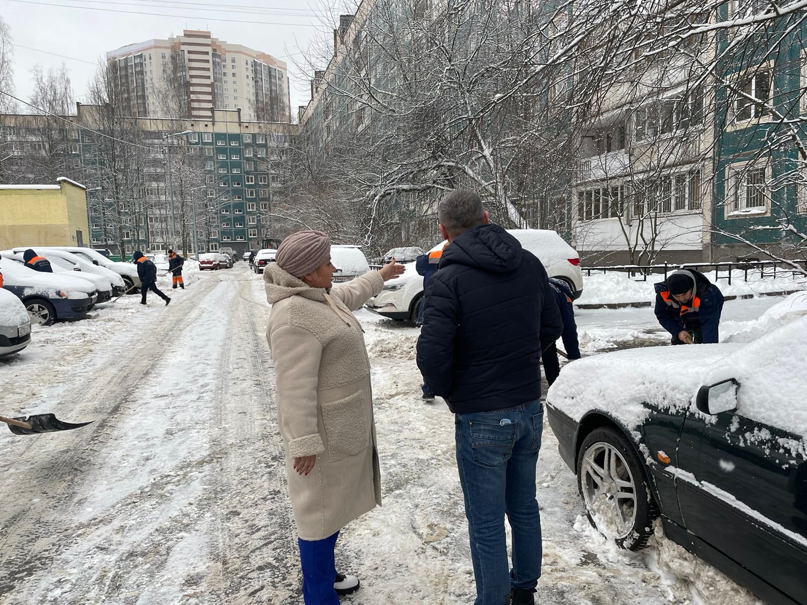 Сегодня заместитель главы администрации Выборгского района Арина Артемова проинспектировала уборку территории от снега.