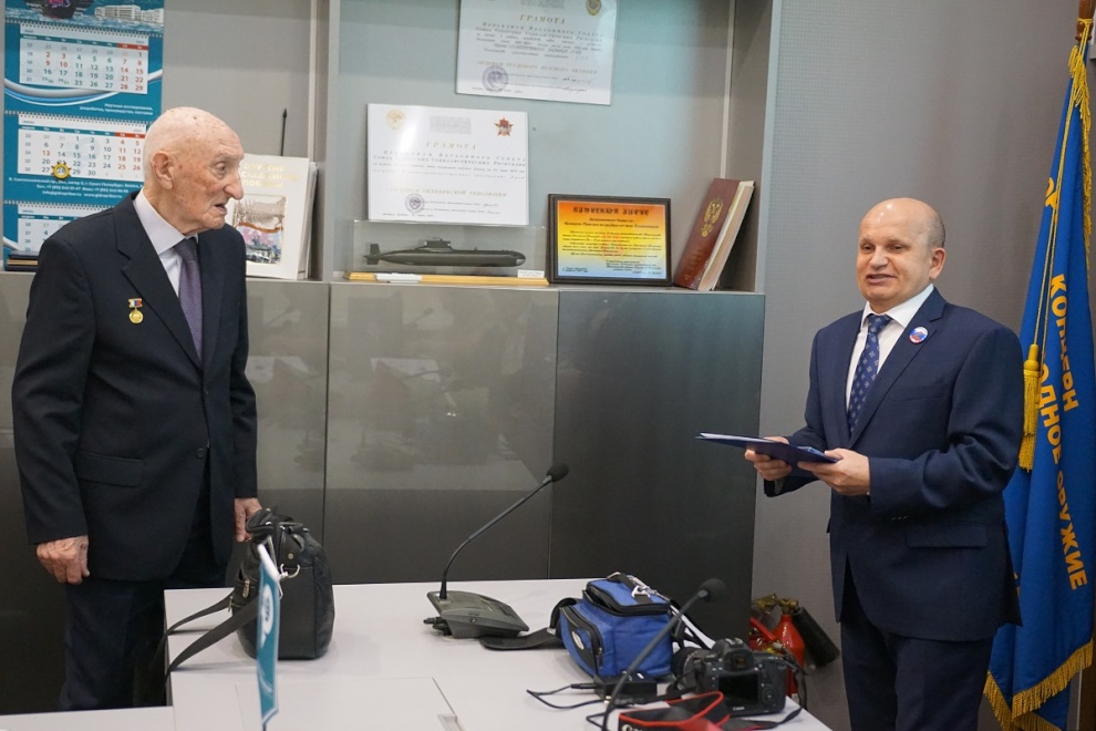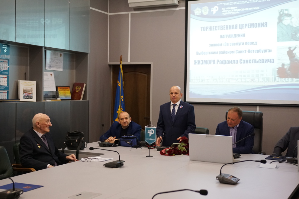 Сегодня глава Виктор Полунин посетил АО «Концерн «Морское подводное оружие – Гидроприбор», где вручил почетный знак «За заслуги перед Выборгским районом» Рафаилу Жизмору, ветерану производства.