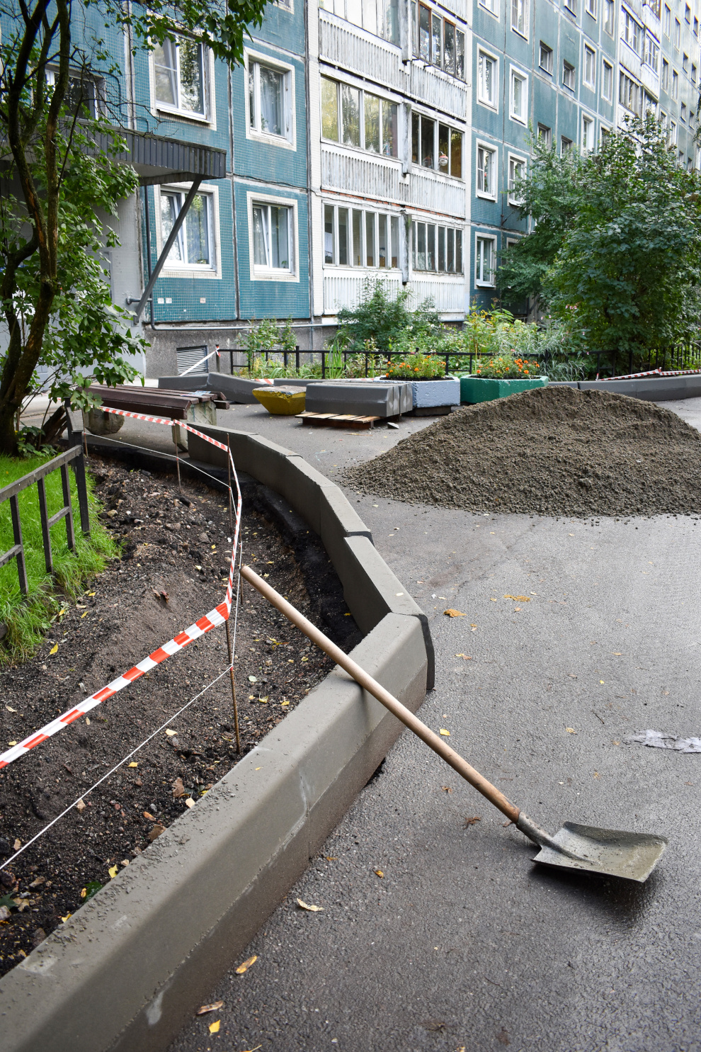 Помимо крупных работ на усовершенствованном покрытии, на многоквартирных домах, находящихся в управлении ООО «ЖКС №2 Выборгского района», ведутся работы по ремонту отмостки и подходов к парадным.