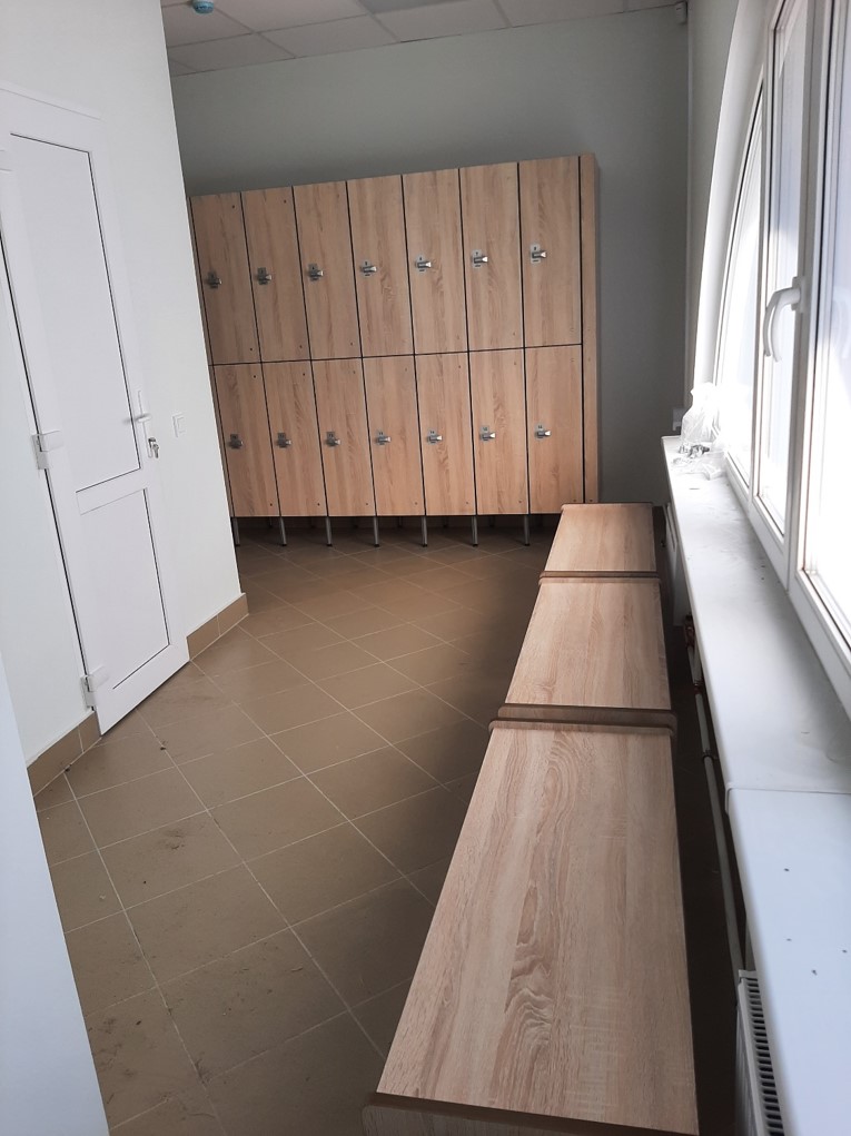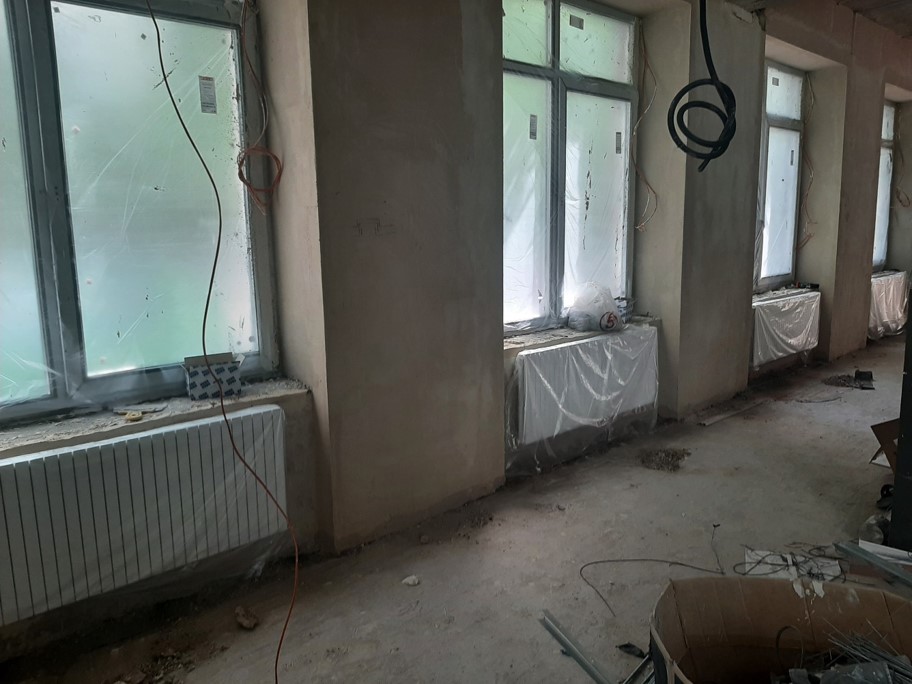 Выполнены работы по монтажу канализационной системы, системы отопления, устройству бетонного покрытия пола (с укладкой гидроизоляции и утеплителя), установке внутренних перегородок и штукатурке стен, ремонту кровли, замене оконных блоков. Ведутся работы по прокладке сетей электроснабжения и слаботочных систем. Установлена система приточно-вытяжной вентиляции. Выполнены работы по замене оконных блоков и устройству отмостки помещения. Ведутся работы по оштукатуриванию фасада помещения. Планируемый срок окончания работ – октябрь 2023 года.