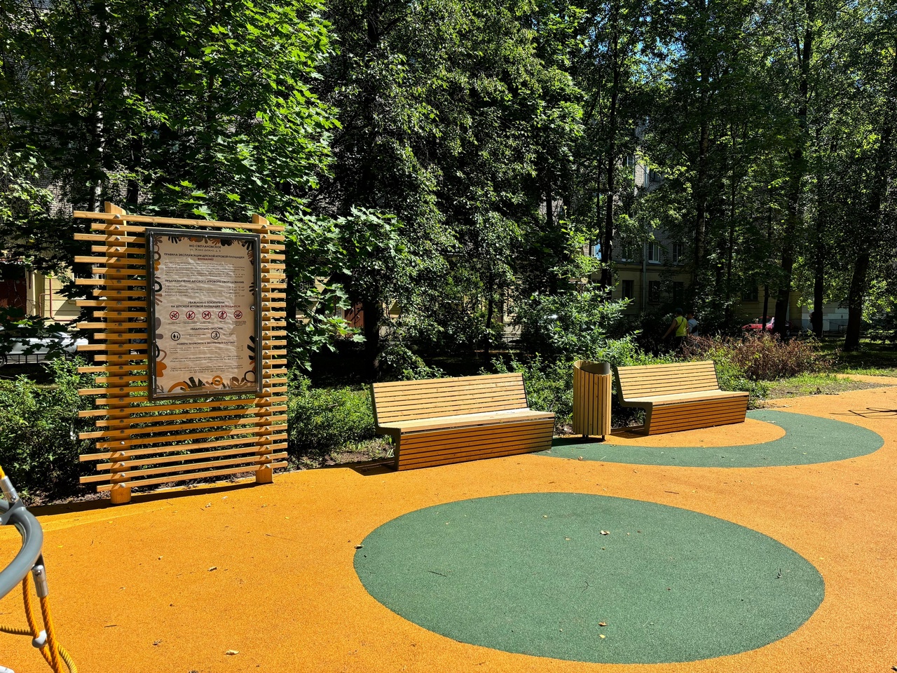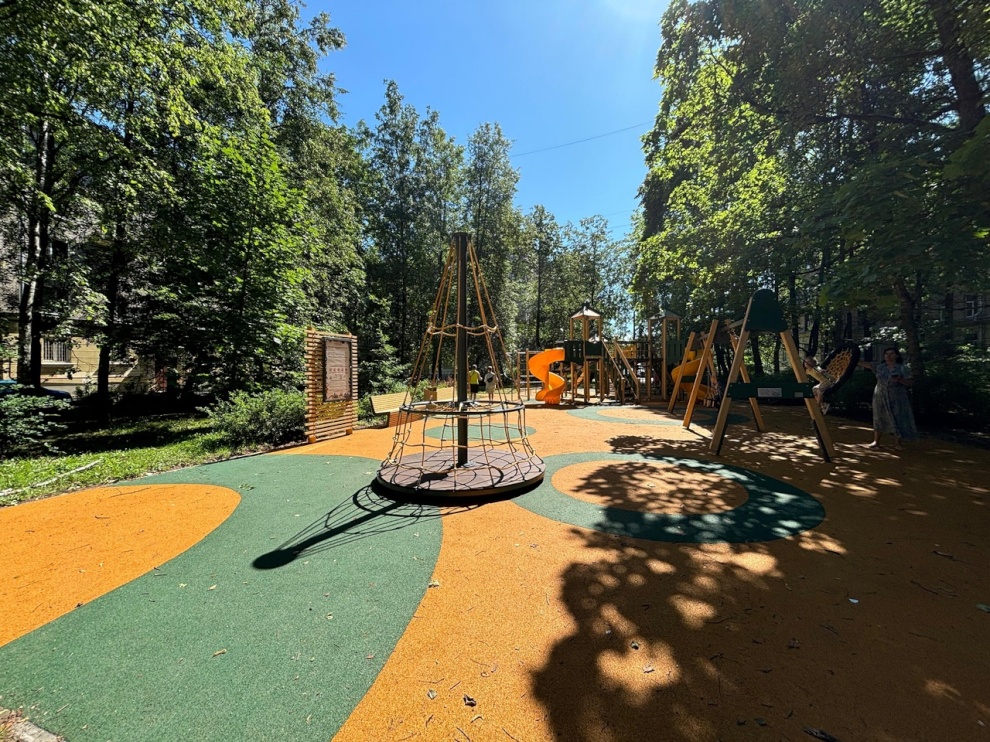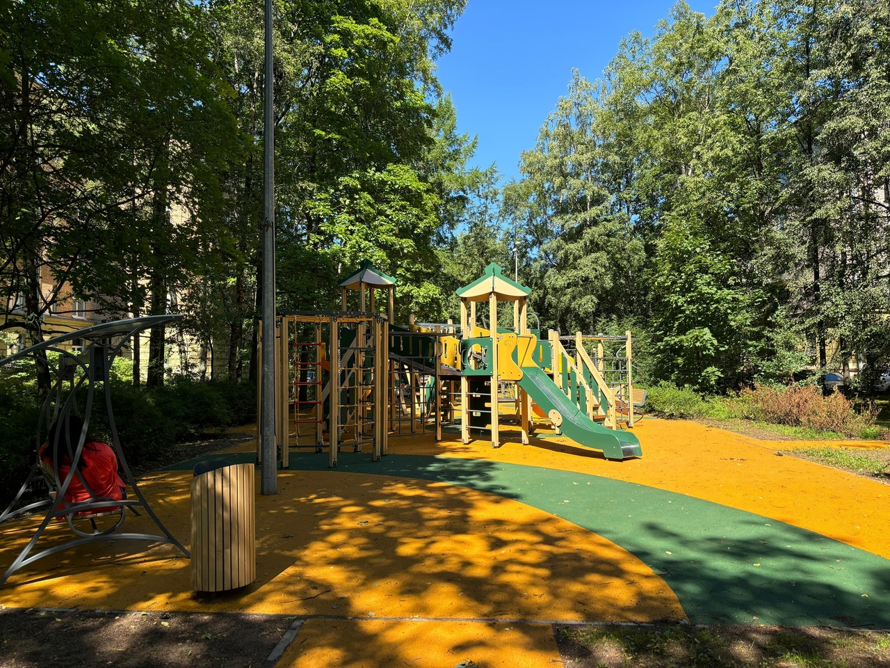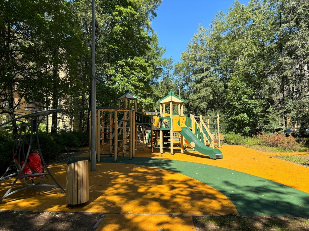 На данном адресе были выполнены работы по замене устаревшего игрового оборудования и ремонту покрытия в рамках реализации программы «Благоустройство территории муниципального образования на 2024 год и плановый период 2025-2026» Администрации МО Светлановское. На новой площадке, площадью 417, 25 м² , размещено 11 элементов благоустройства: игровой комплекс "Омега"; карусель "Юла"; качели "Марина" с подвесами "Паутинка 1000", "Маугли" и "Тарзан"; диван маятниковый с крышей; диван "Пегас"; урна "Карандаш" информационный стенд "Постулат", резиновое покрытие.