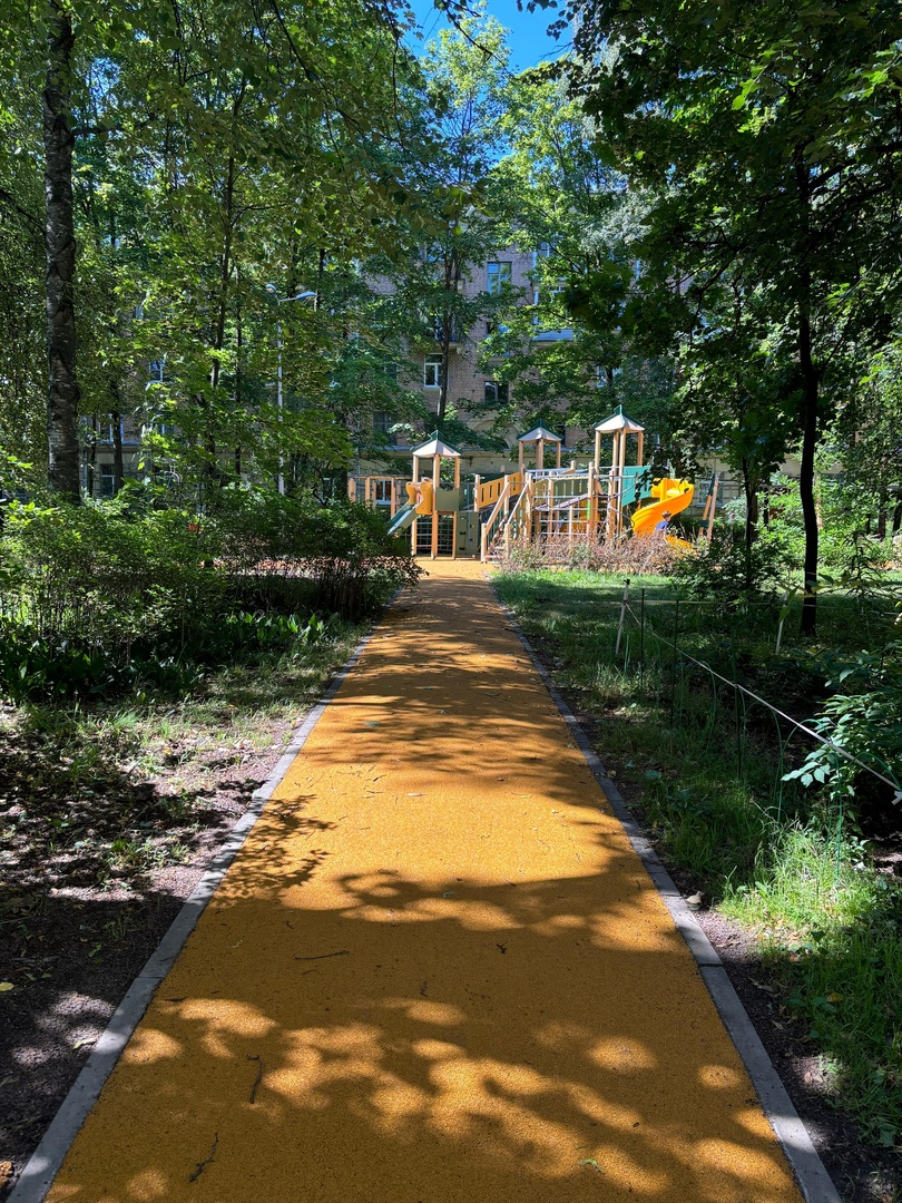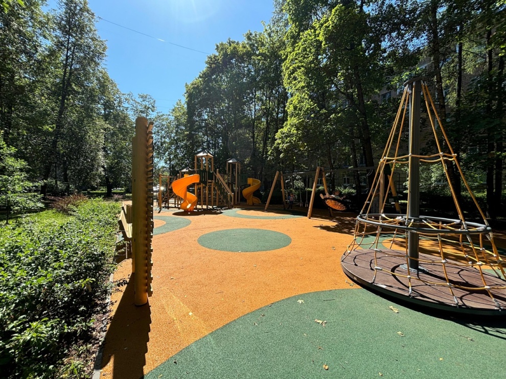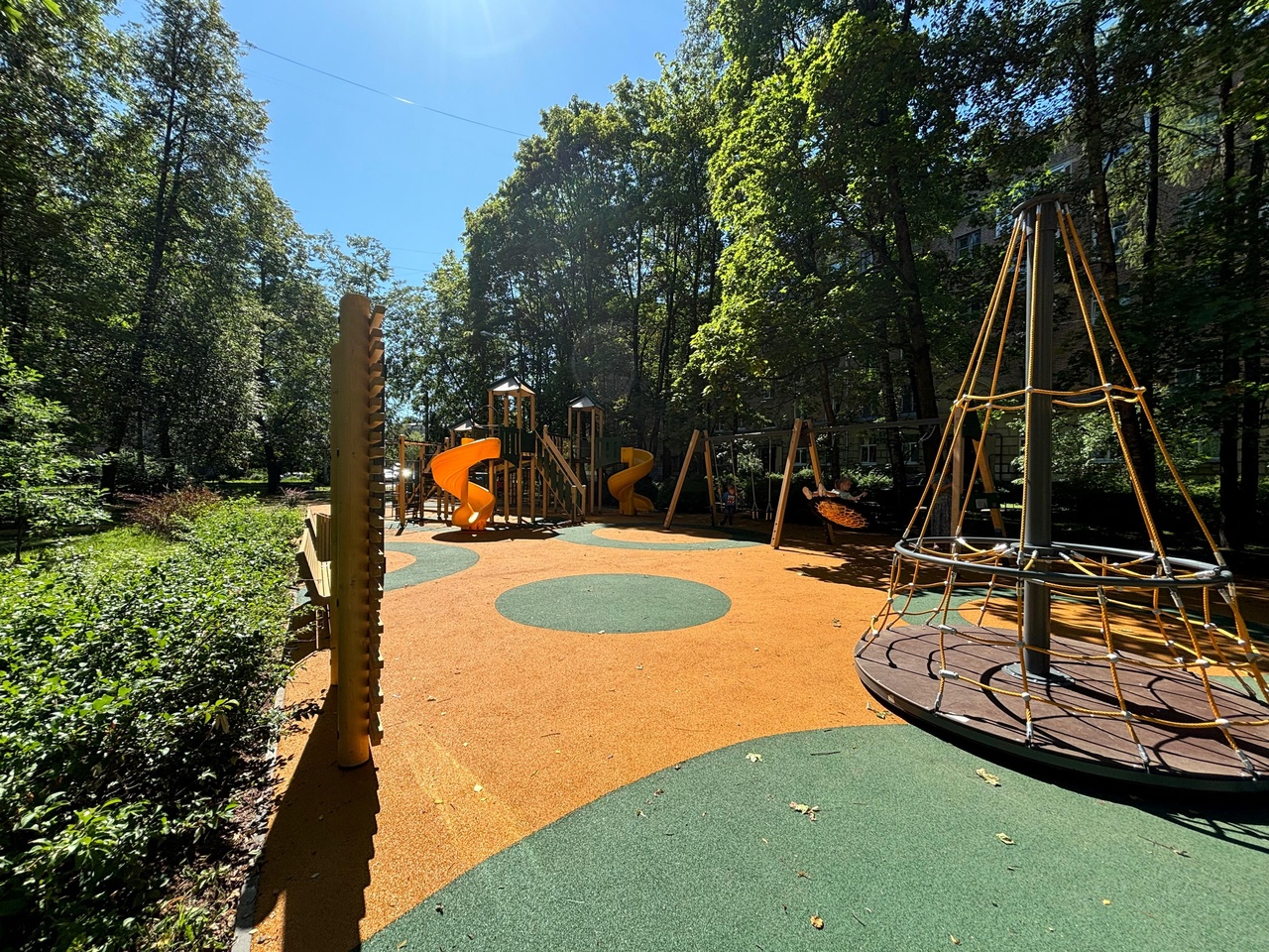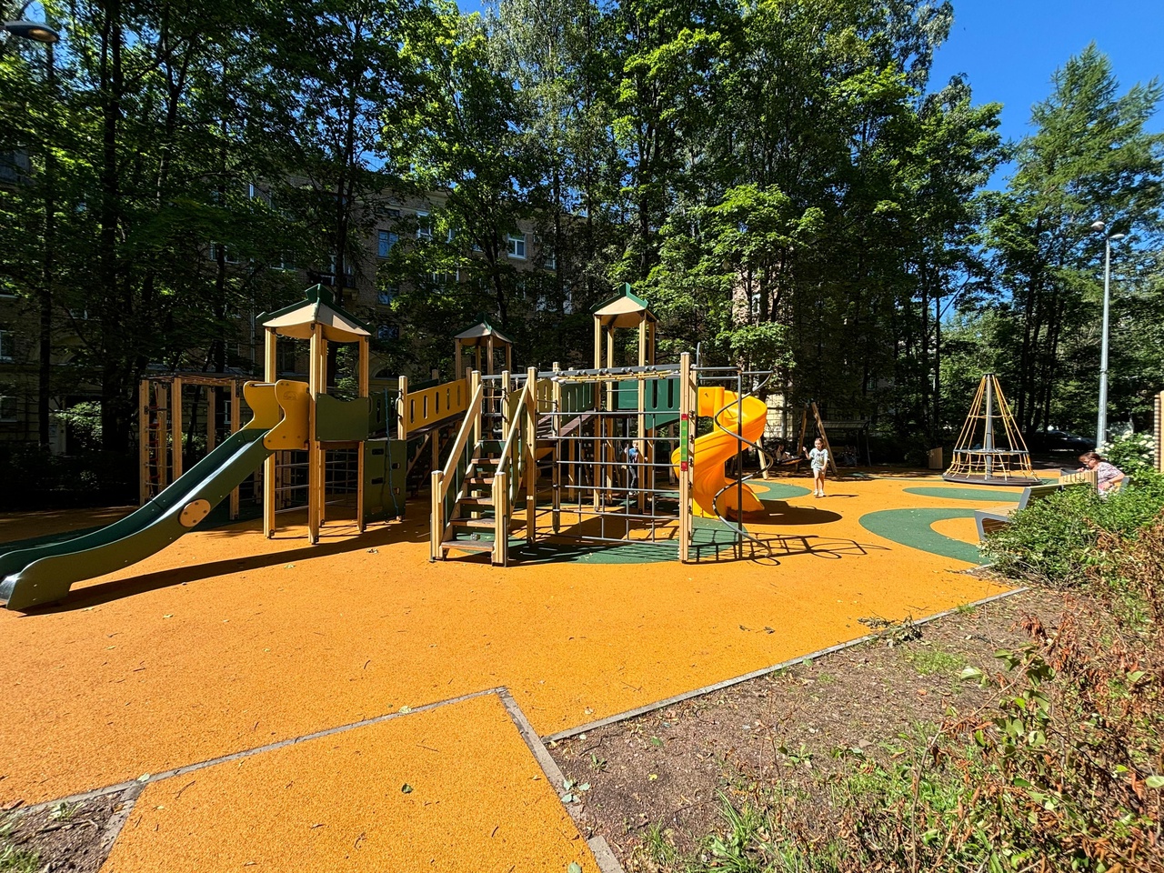 На данном адресе были выполнены работы по замене устаревшего игрового оборудования и ремонту покрытия в рамках реализации программы «Благоустройство территории муниципального образования на 2024 год и плановый период 2025-2026» Администрации МО Светлановское. На новой площадке, площадью 417, 25 м² , размещено 11 элементов благоустройства: игровой комплекс "Омега"; карусель "Юла"; качели "Марина" с подвесами "Паутинка 1000", "Маугли" и "Тарзан"; диван маятниковый с крышей; диван "Пегас"; урна "Карандаш" информационный стенд "Постулат", резиновое покрытие.