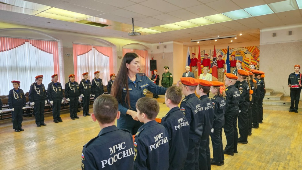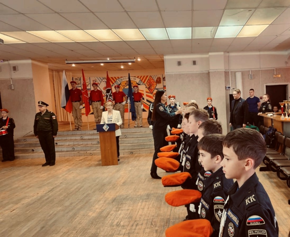 Для проведения торжественной церемонии посвящения воспитанников в кадеты на сцену был приглашен представитель управления по Выборгскому району Главного управления МЧС России по г. Санкт‑Петербургу капитан внутренней службы Реутова Валерия, которая вручила оранжевые береты МЧС России юным кадетам и поздравила ребят со вступлением на новый этап жизненного пути.