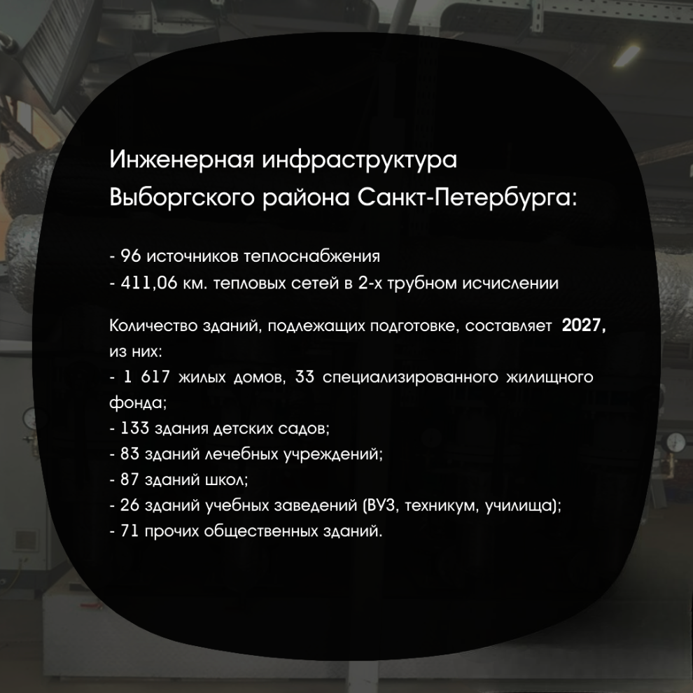 Энергетический комплекс Выборгского района Санкт‑Петербурга обеспечивает надежное и бесперебойное функционирование экономики и жилищно-коммунального хозяйства. Состав инженерной инфраструктуры представлен выше.