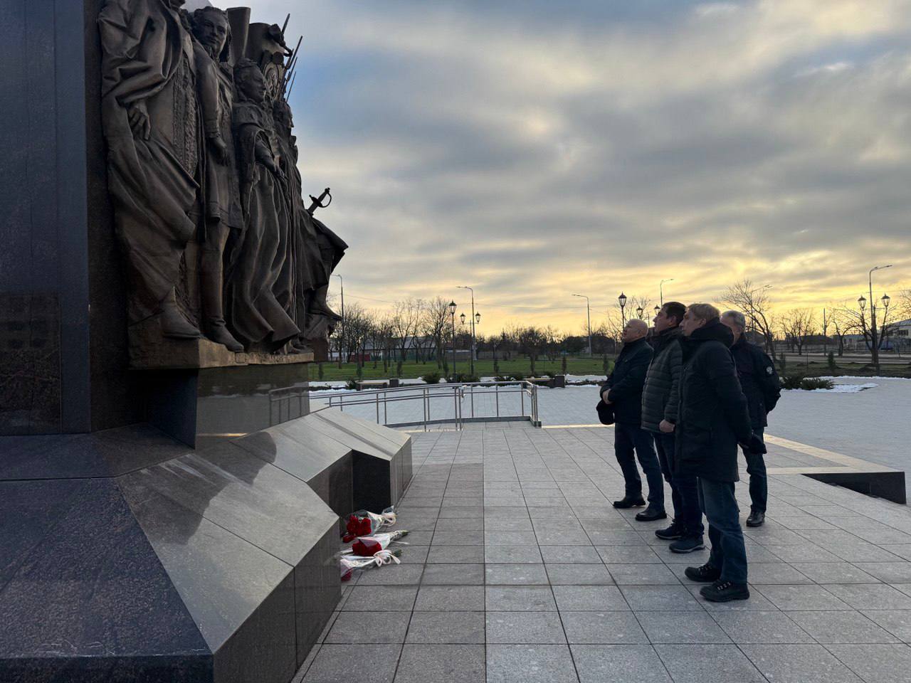 Вместе с руководителем Представительства Санкт‑Петербурга в Мариуполе Олегом Моргуном Валерий Москаленко возложил цветы к монументу «Мариуполь - Город воинской славы» — символу стойкости и героического характера его жителей.