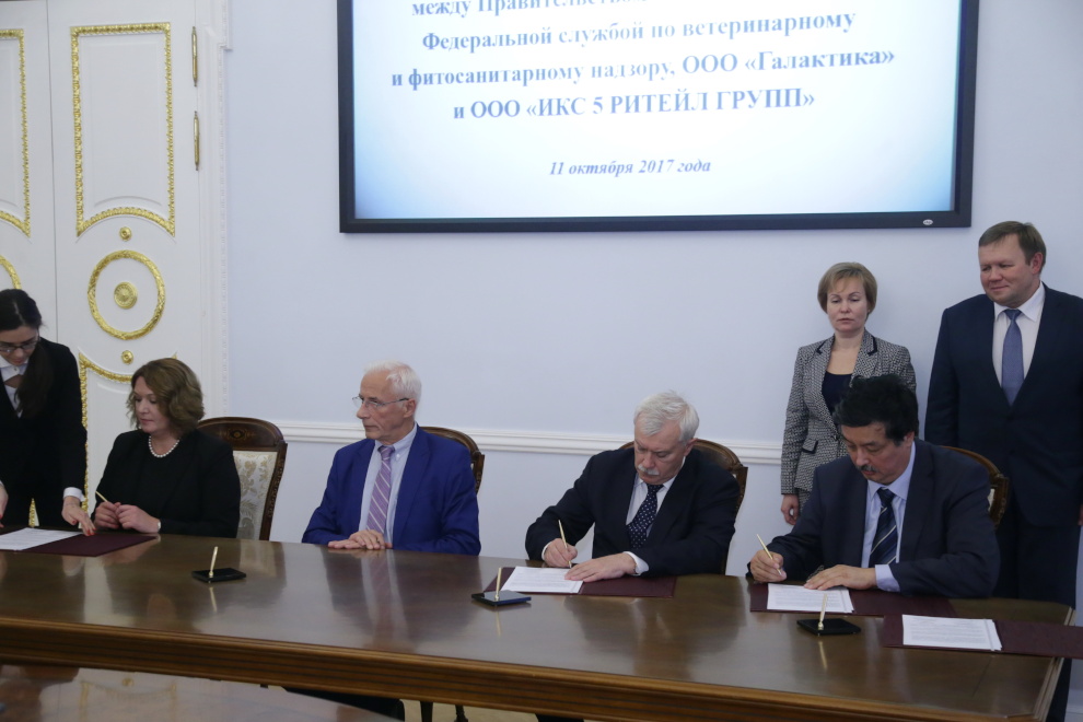 Сегодня в Смольном губернатор Георгий Полтавченко, представители руководства Федеральной службы по ветеринарному и фитосанитарному надзору, компаний «Галактика» и «Икс 5 Ритейл Групп» подписали Соглашение о сотрудничестве.