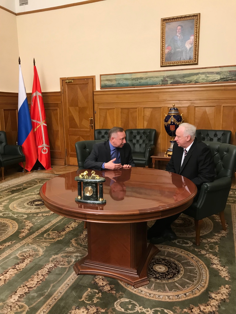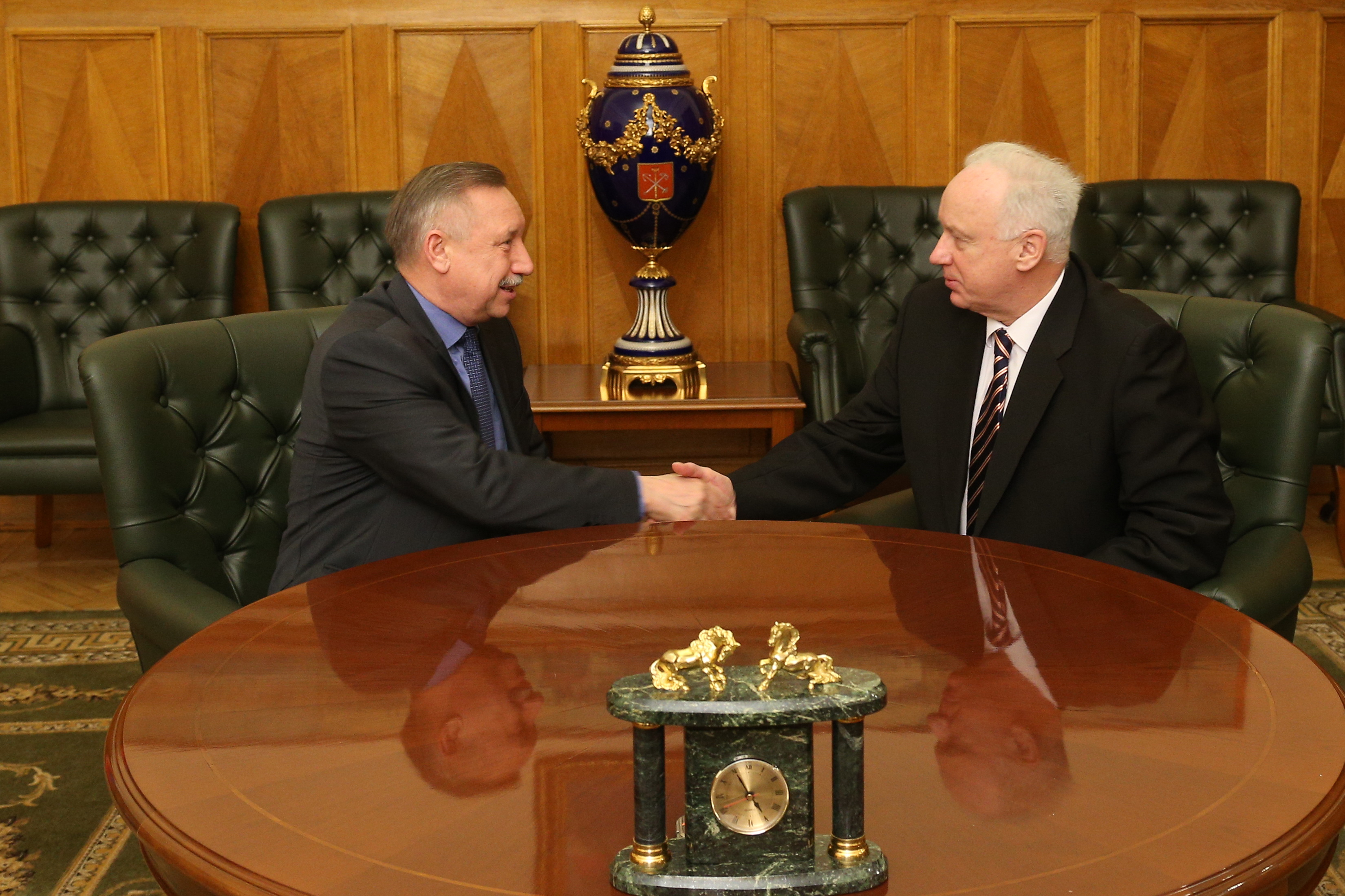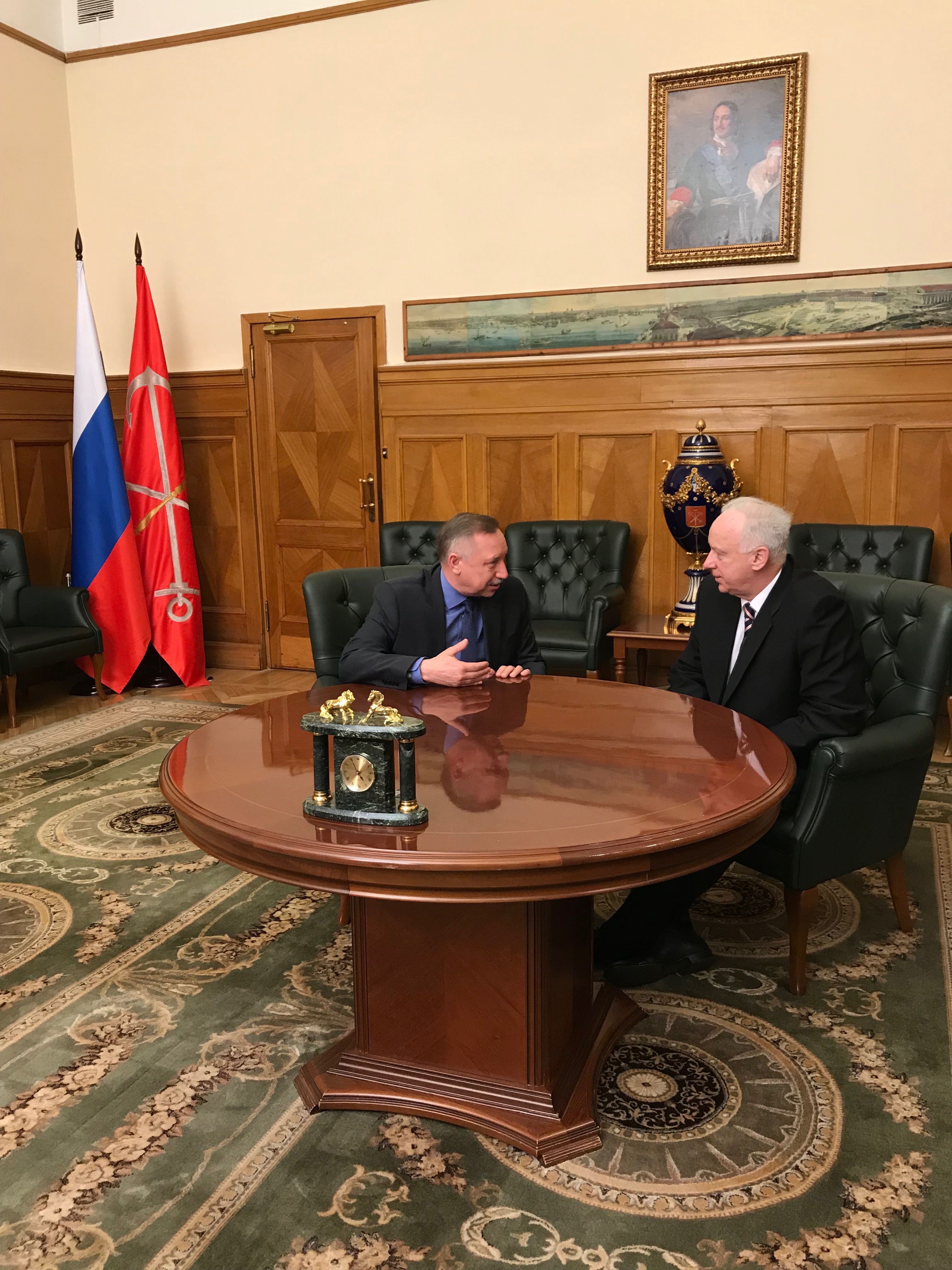 Сегодня в Смольном состоялась встреча временно исполняющего обязанности Губернатора города Александра Беглова и председателя Следственного комитета Российской Федерации Александра Бастрыкина, который находится с рабочим визитом в Санкт‑Петербурге.