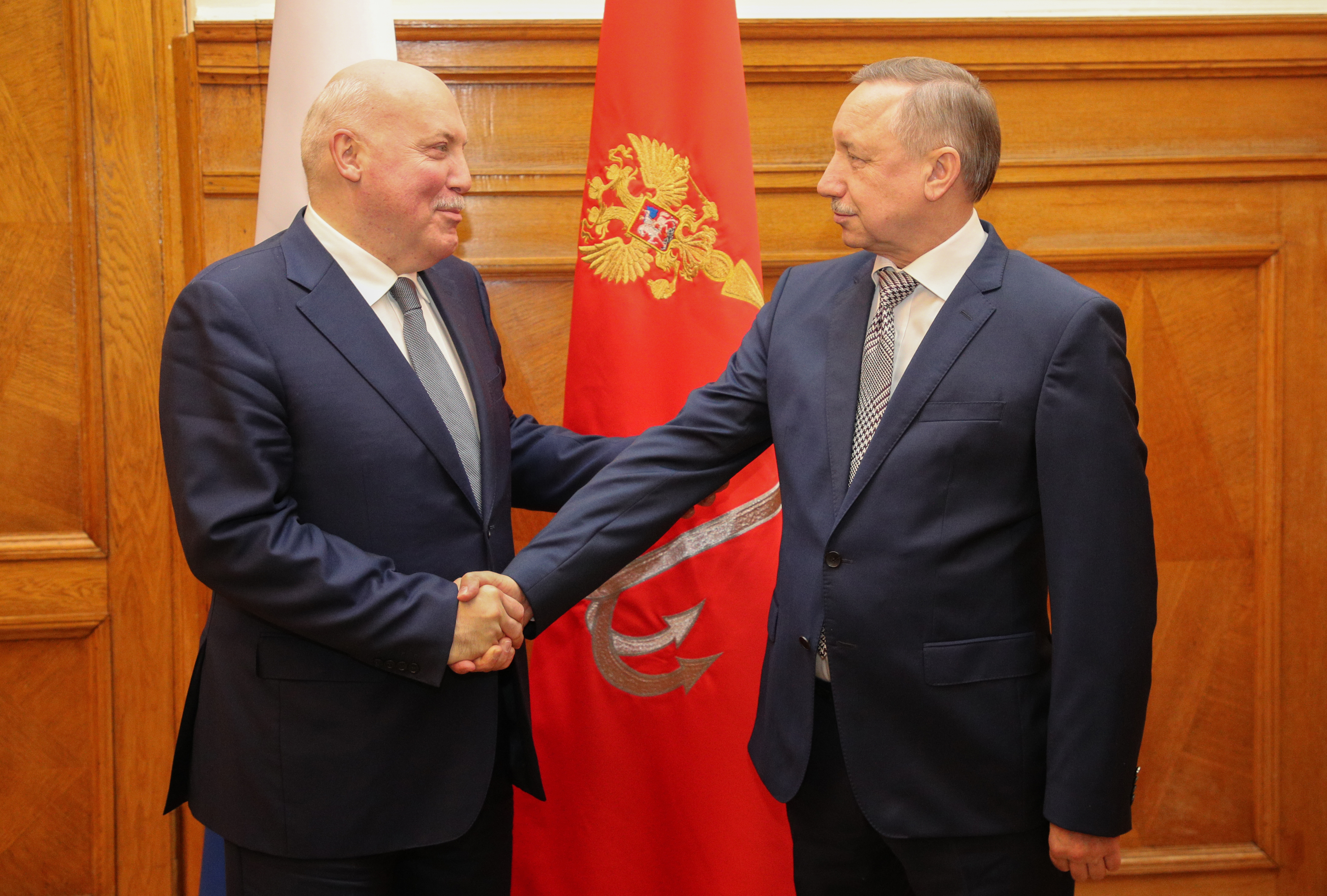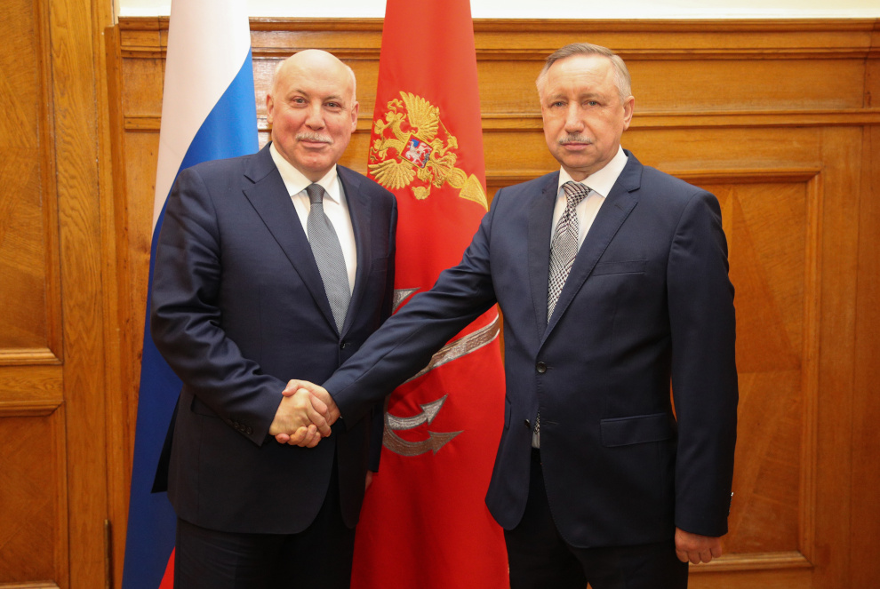 Сегодня губернатор Александр Беглов провел рабочую встречу с Чрезвычайным и Полномочным послом Российской Федерации в Республике Беларусь Дмитрием Мезенцевым.