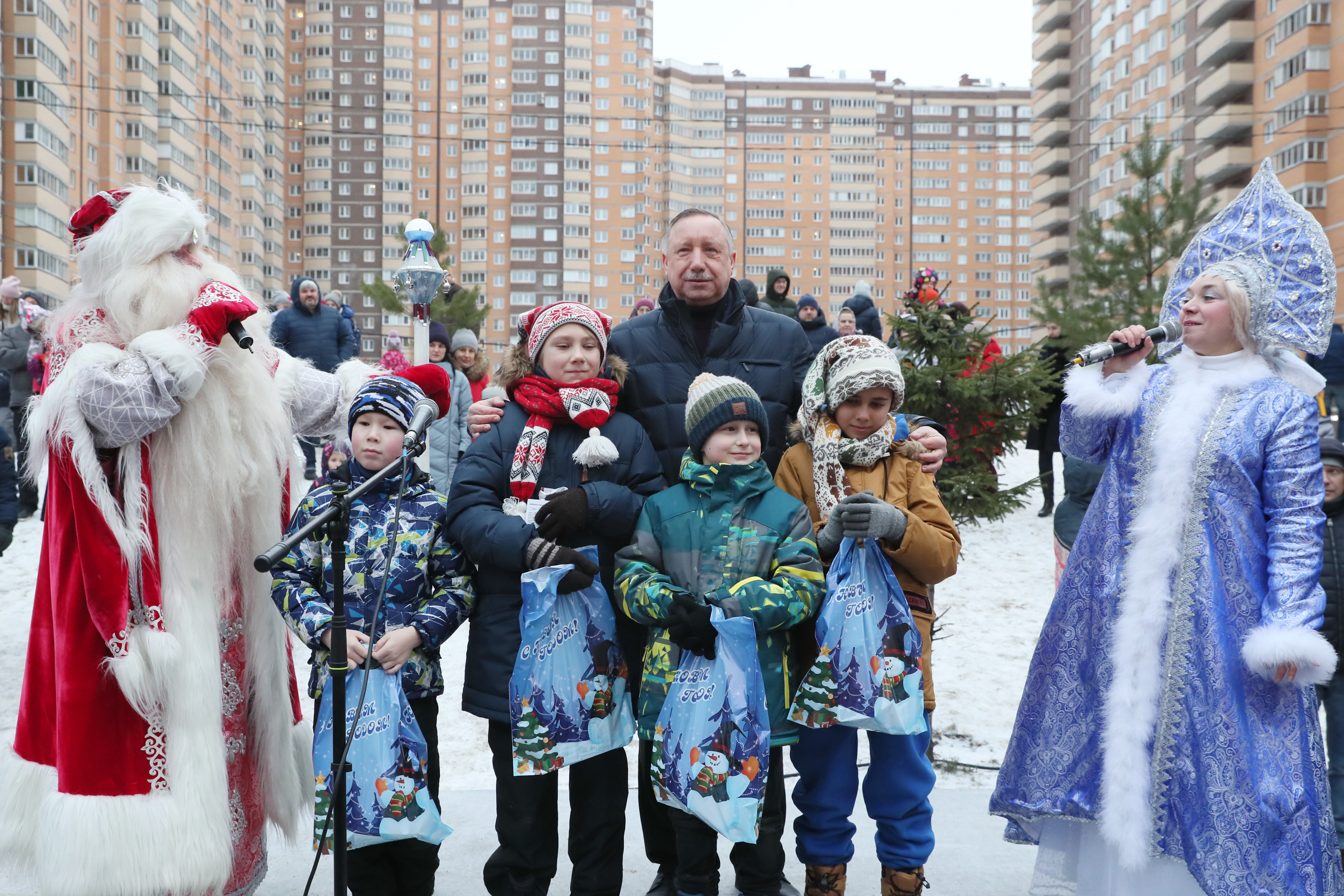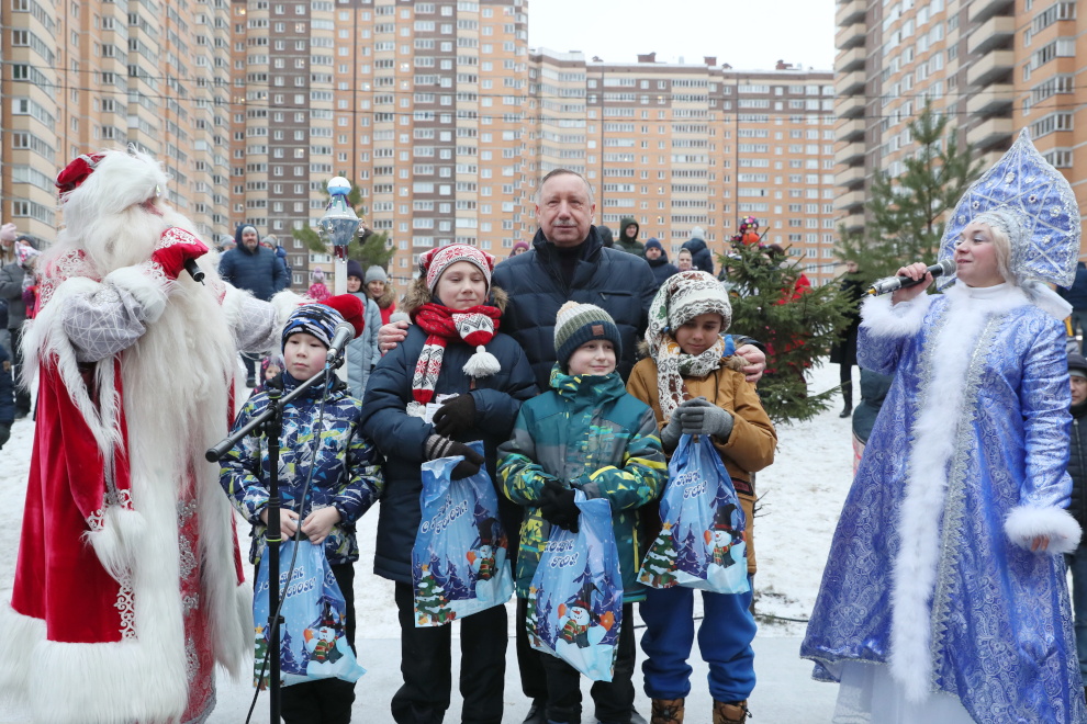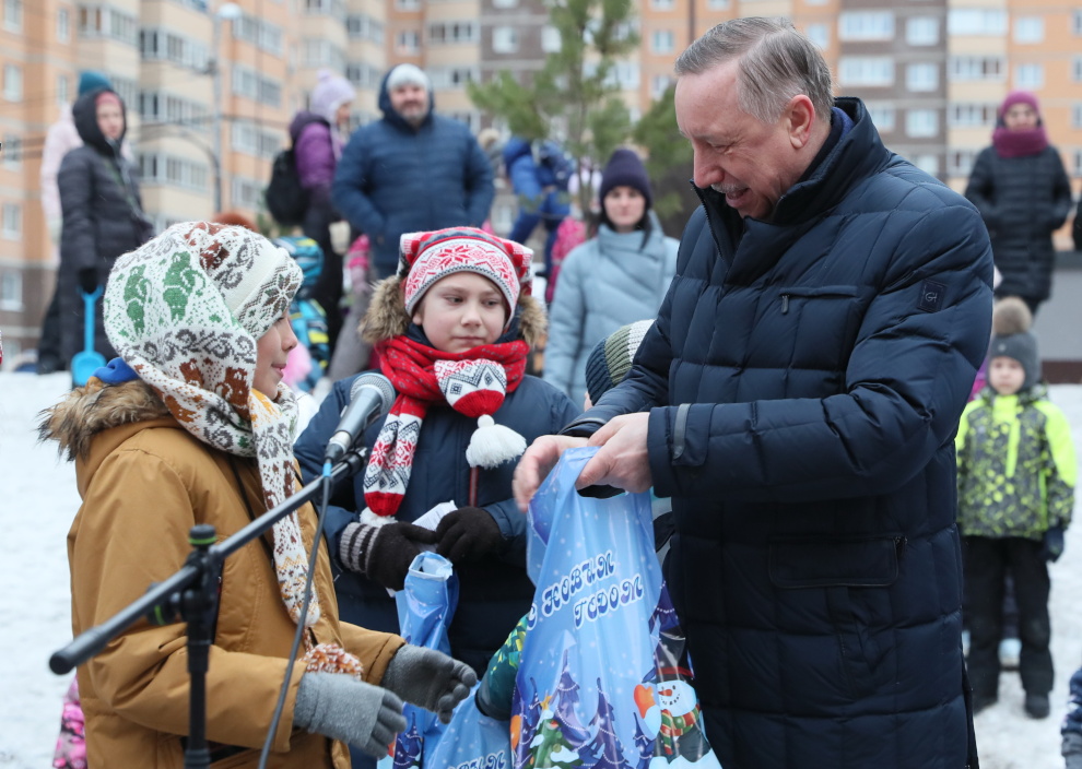 На народных гуляниях в квартале Александр Беглов вручил подарки детям – победителям викторины по истории города и района.