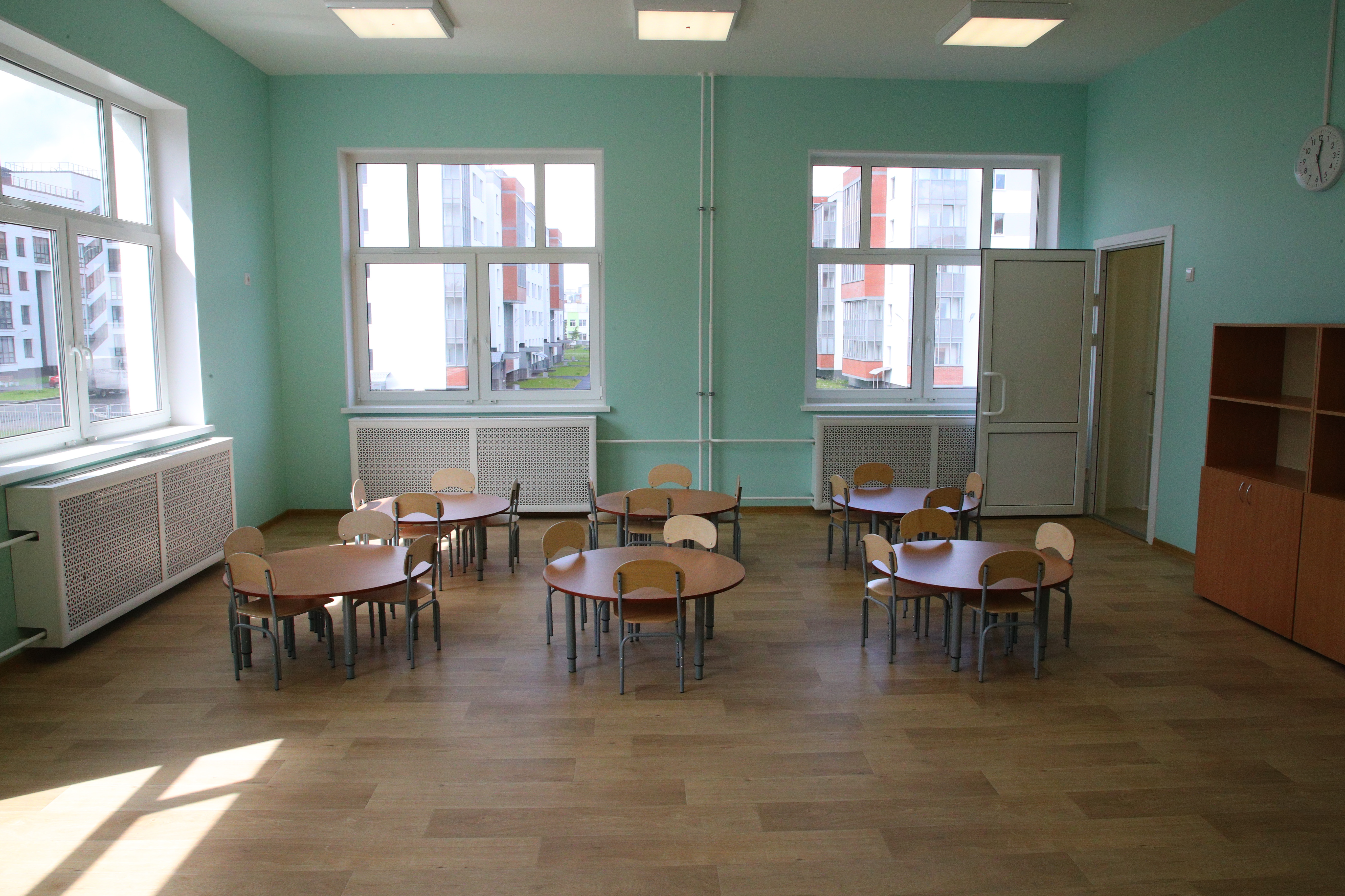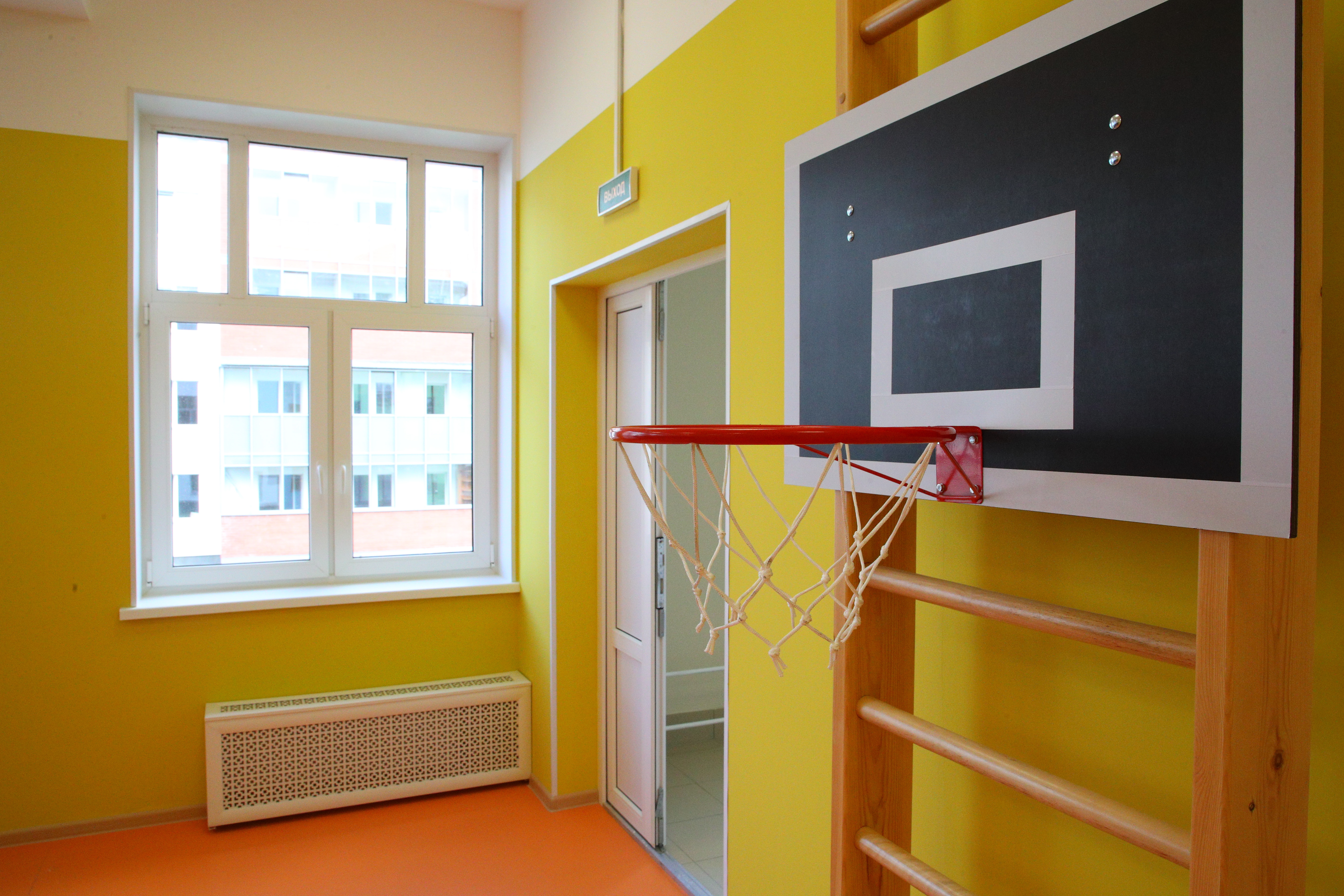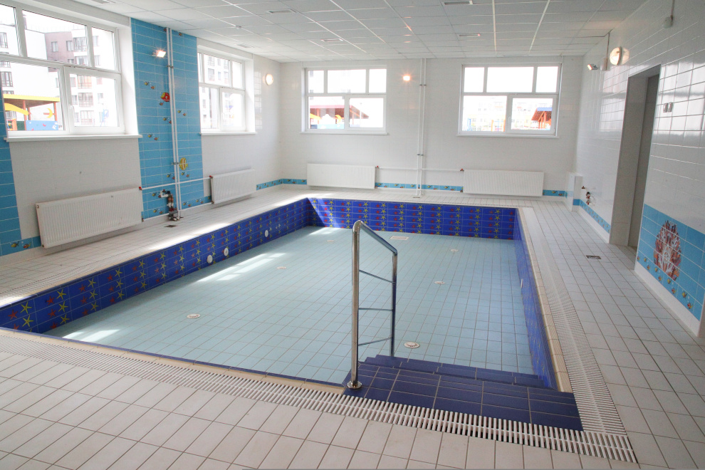 В четырехэтажном здании есть бассейн, музыкальный и спортивный залы, кабинеты логопеда, психолога, помещения для кружков.