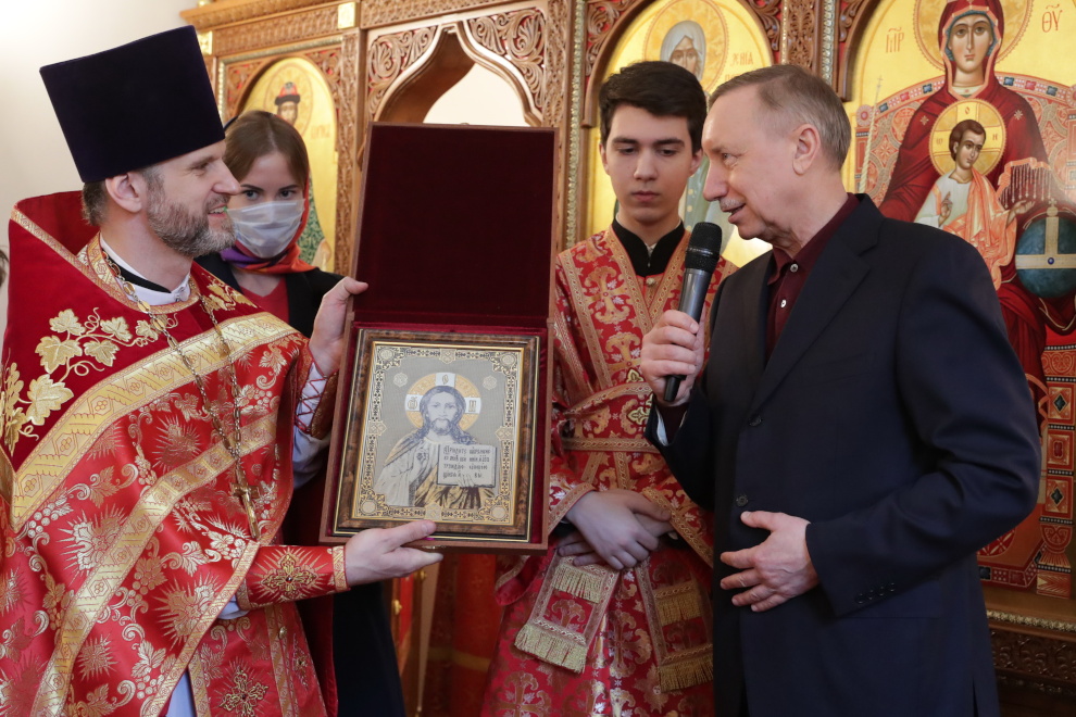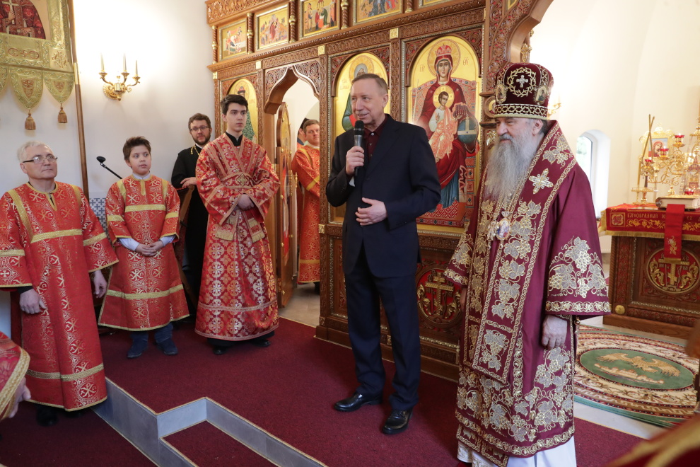 Александр Беглов поздравил всех участников церемонии с праздником Пасхи. Он особо поблагодарил владыку Варсонофия за создание нового храма. Он построен на территории бывшего военного городка. Воинской части, которой принадлежал городок, сегодня исполняется 68 лет.