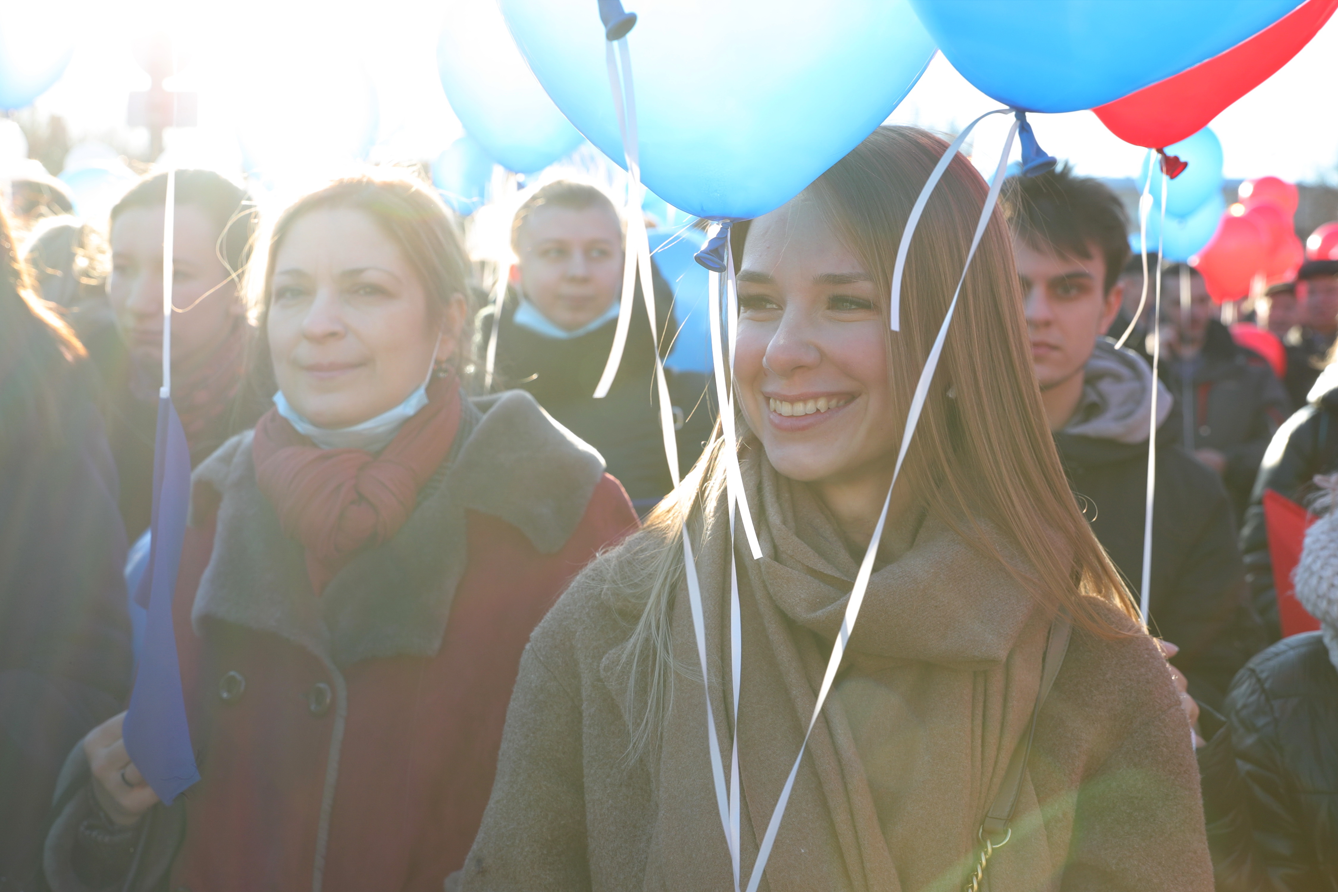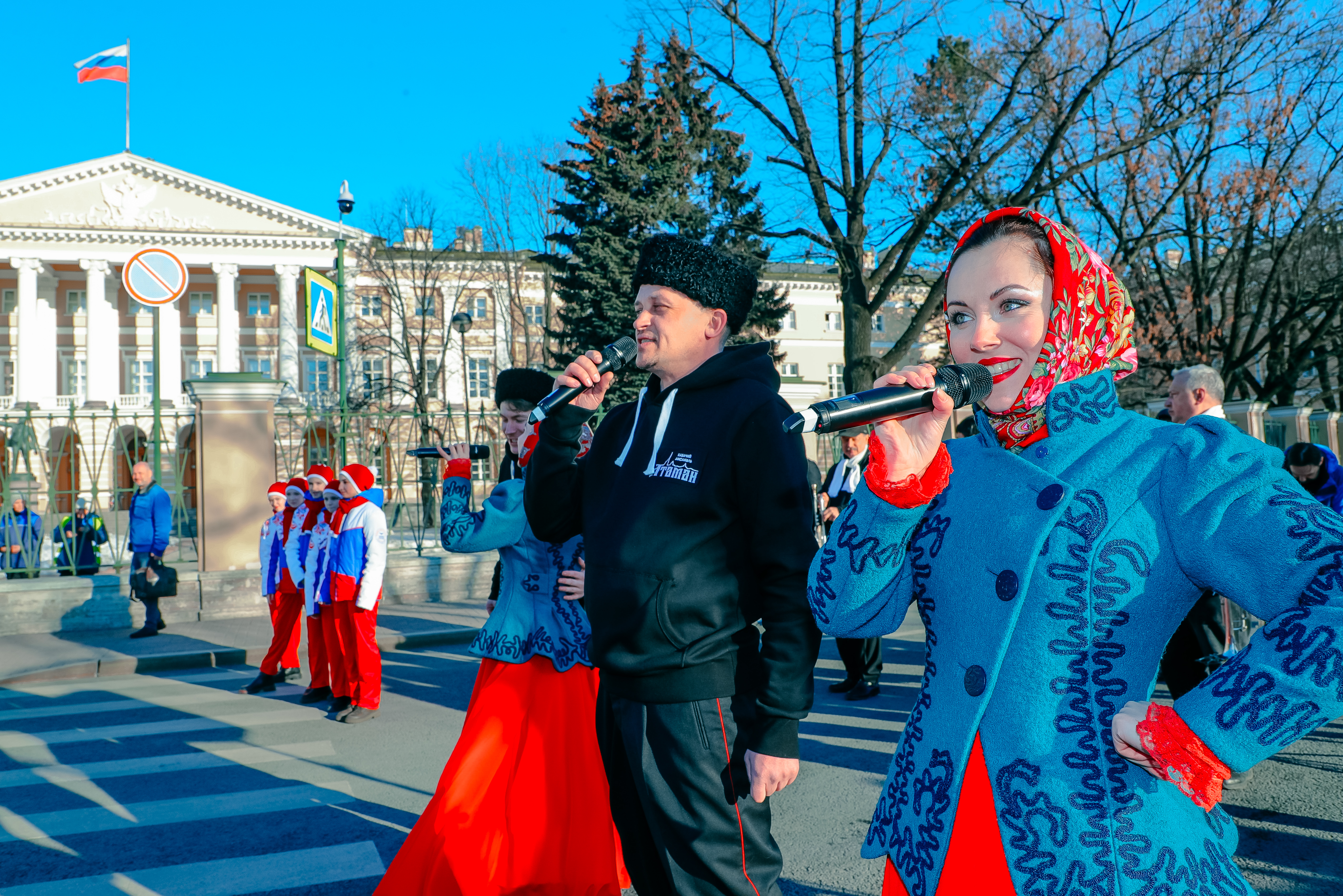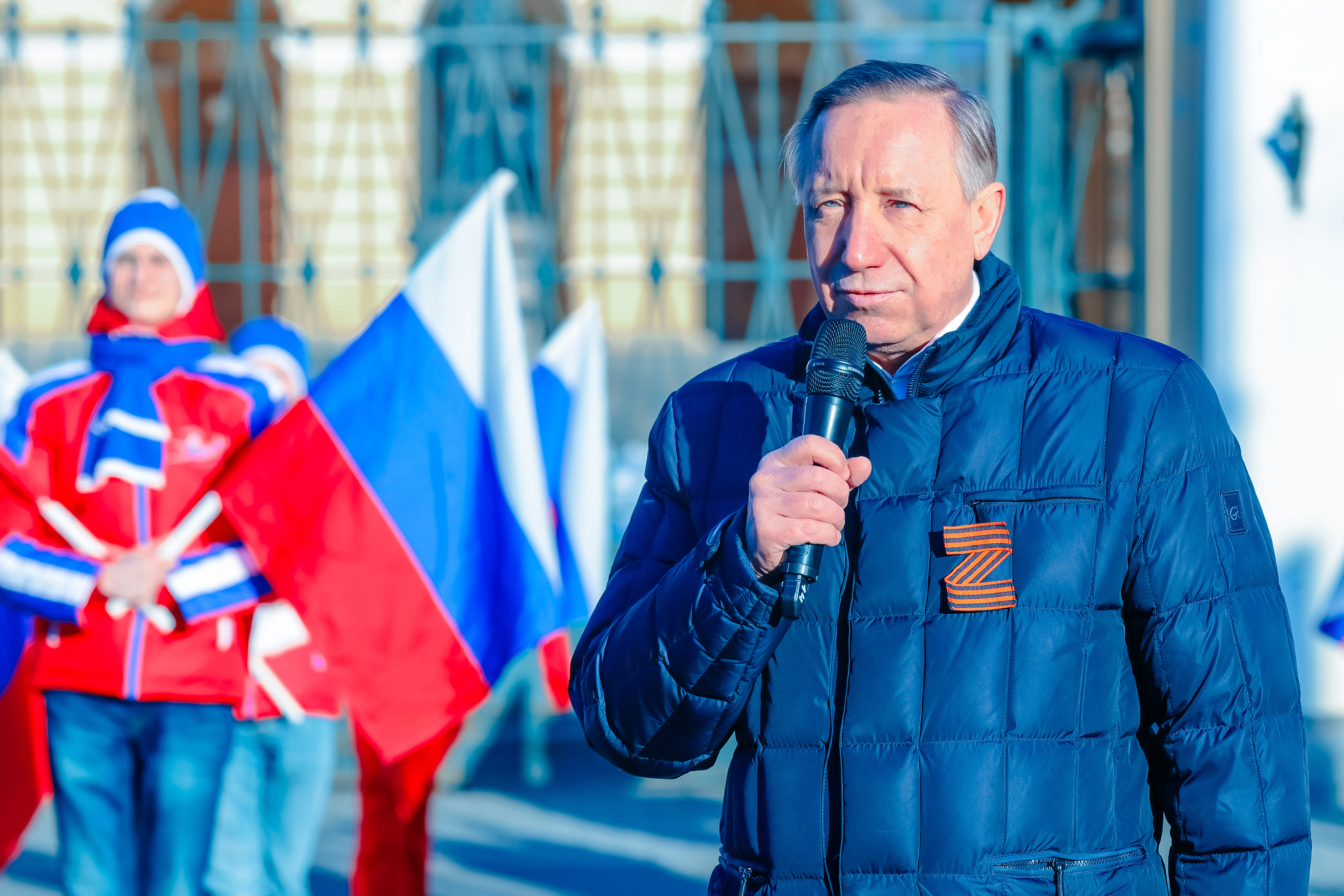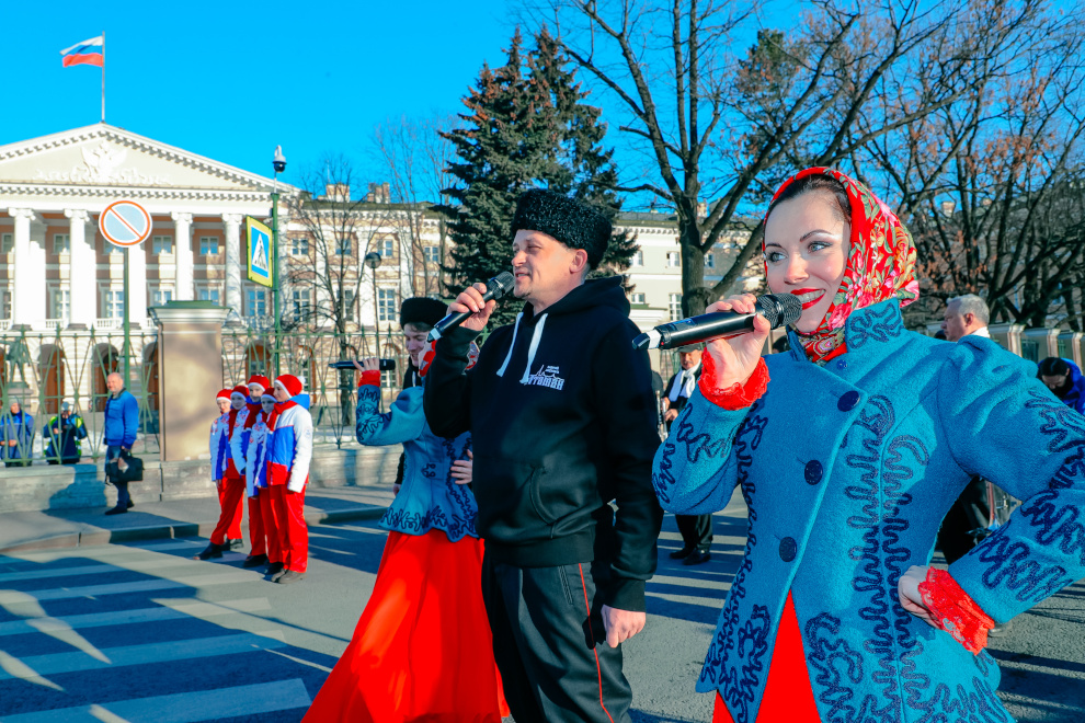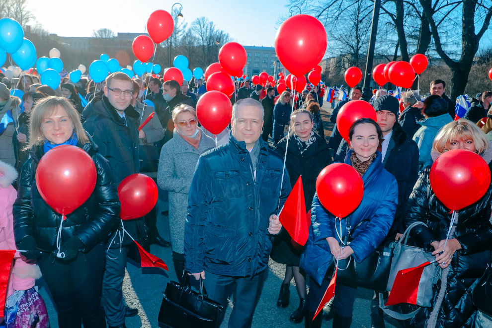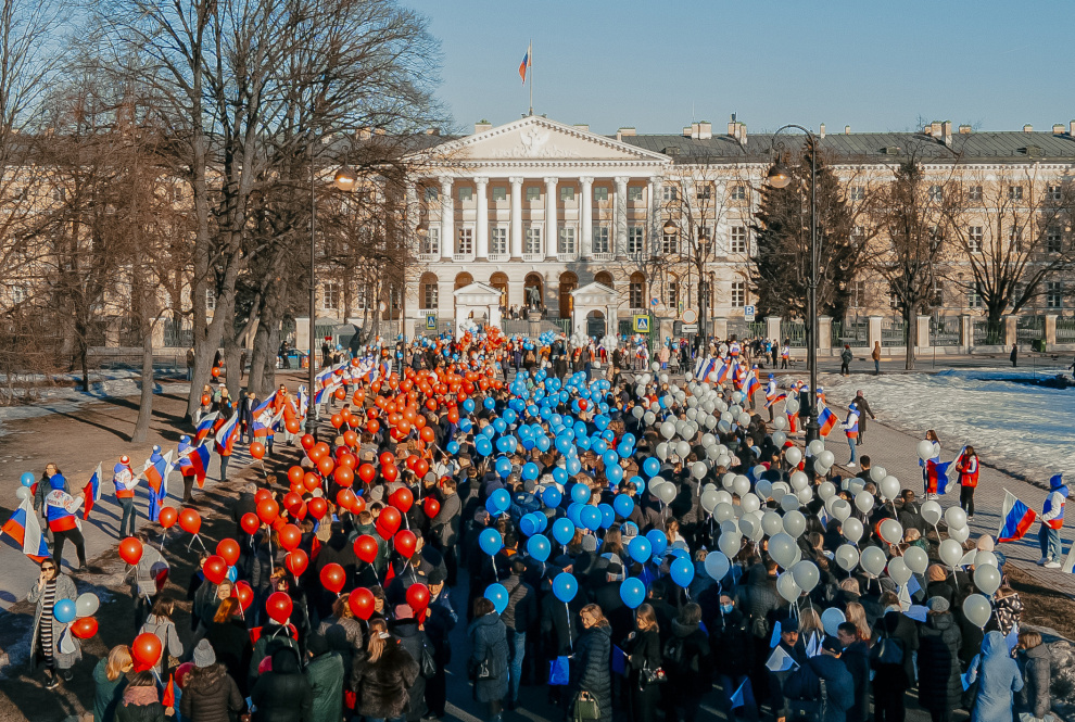 Сотрудники Администрации Губернатора Санкт‑Петербурга и исполнительных органов власти после окончания рабочего дня выстроились в колонну, украшенную цветами российского флага. Таким образом они выразили поддержку Президенту России и российской армии, принимающей участие в спецоперации, а также приветствовали жителей Крыма.