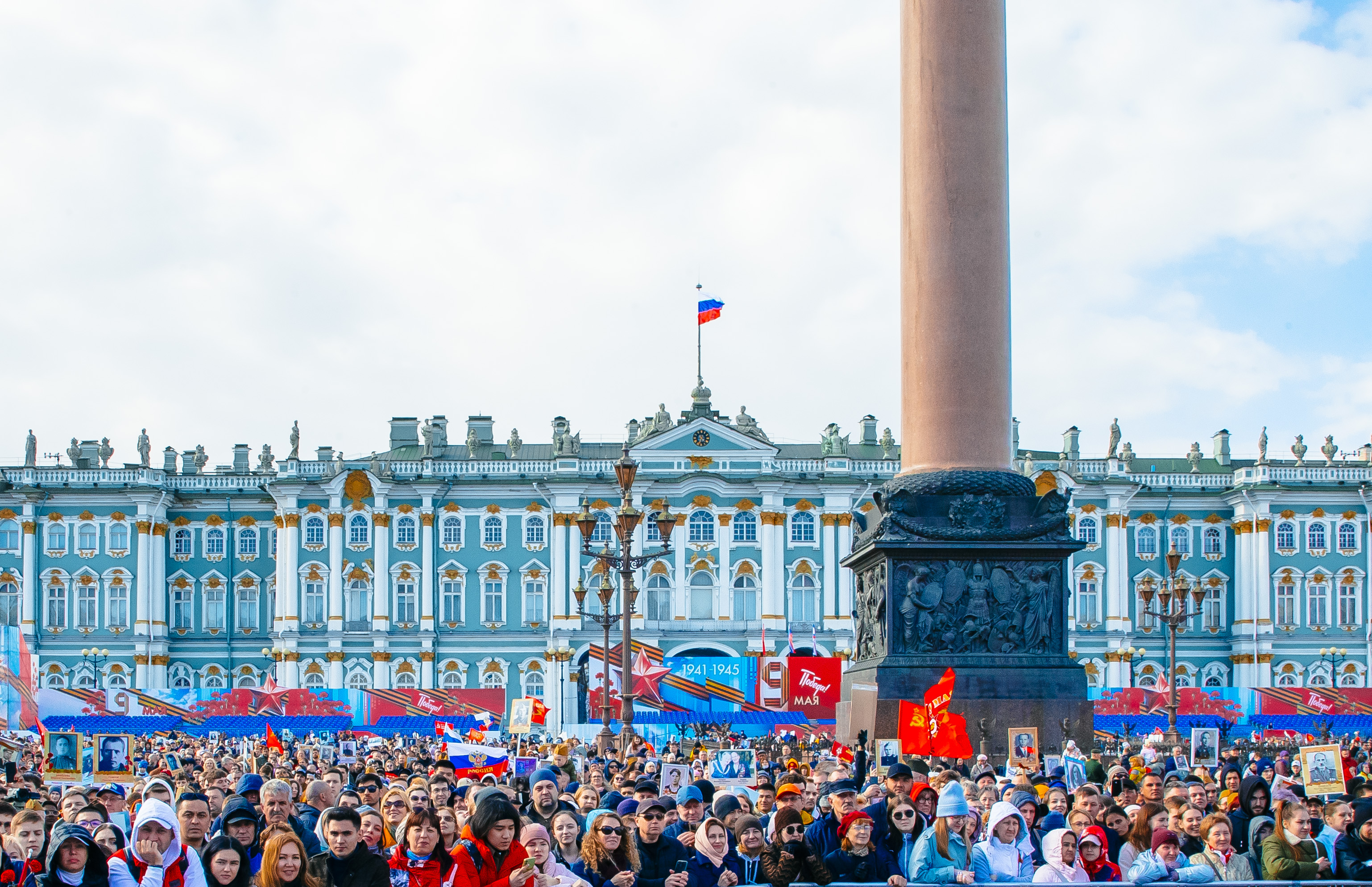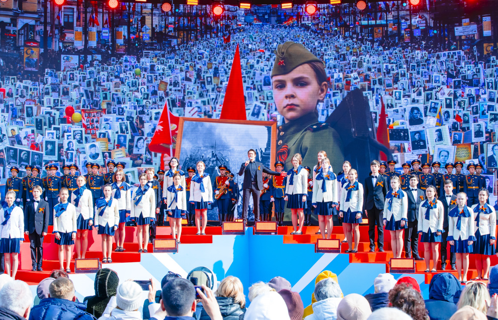Шествие Бессмертного полка в Петербурге, в котором приняли участие более миллиона человек, завершилось большим праздничным концертом «Песни нашей Победы» на Дворцовой площади.