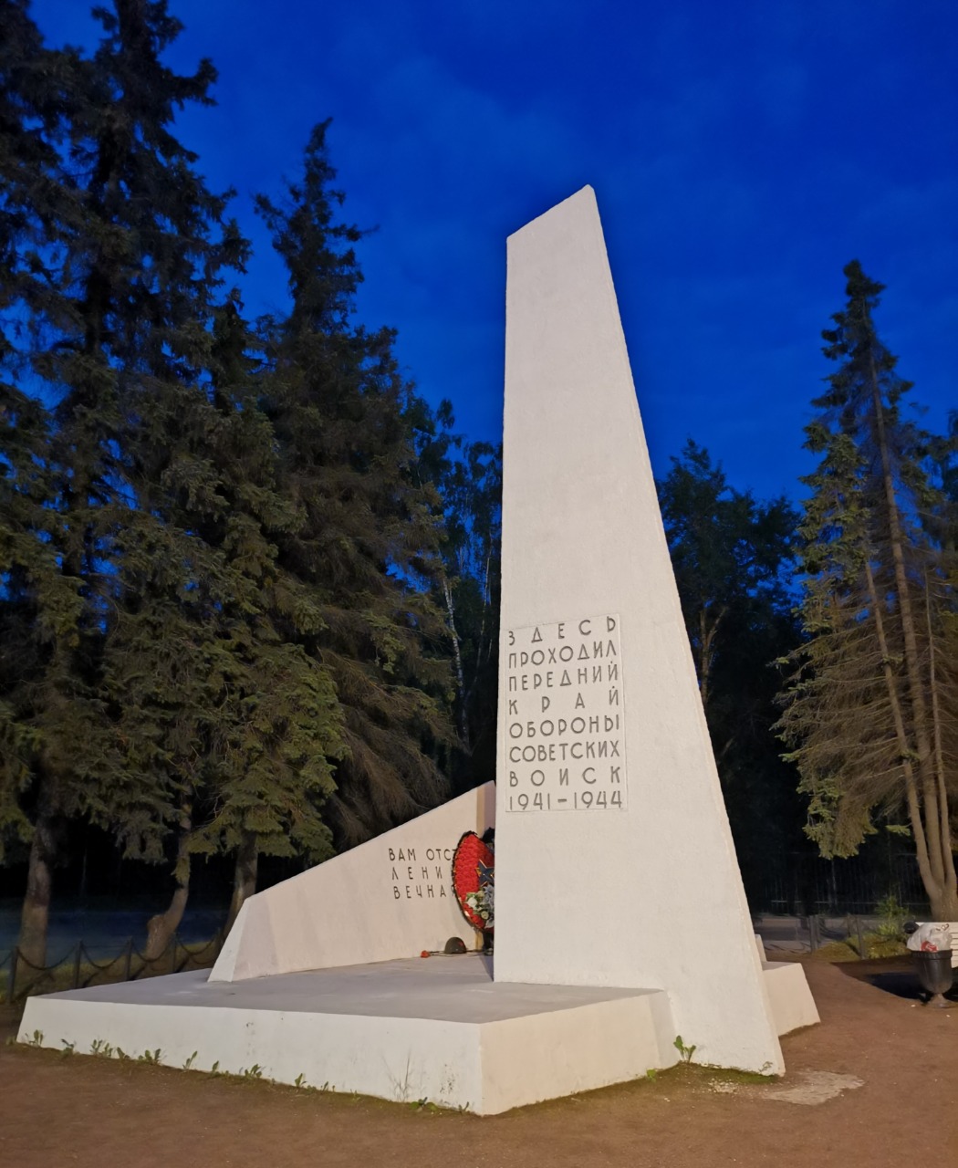 Благодаря мощному прожектору светом обозначены бетонная стела и надпись: «Здесь проходил передний край обороны советских войск. 1941—1944».