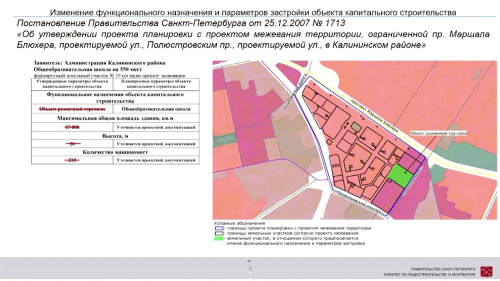 В результате на территории, ограниченной пр. Маршала Блюхера, проектируемой улицей и Полюстровским пр., вместо объекта розничной торговли будет построена школа на 550 мест. Проектирование и строительство школы планируется выполнить за счёт инвестора.