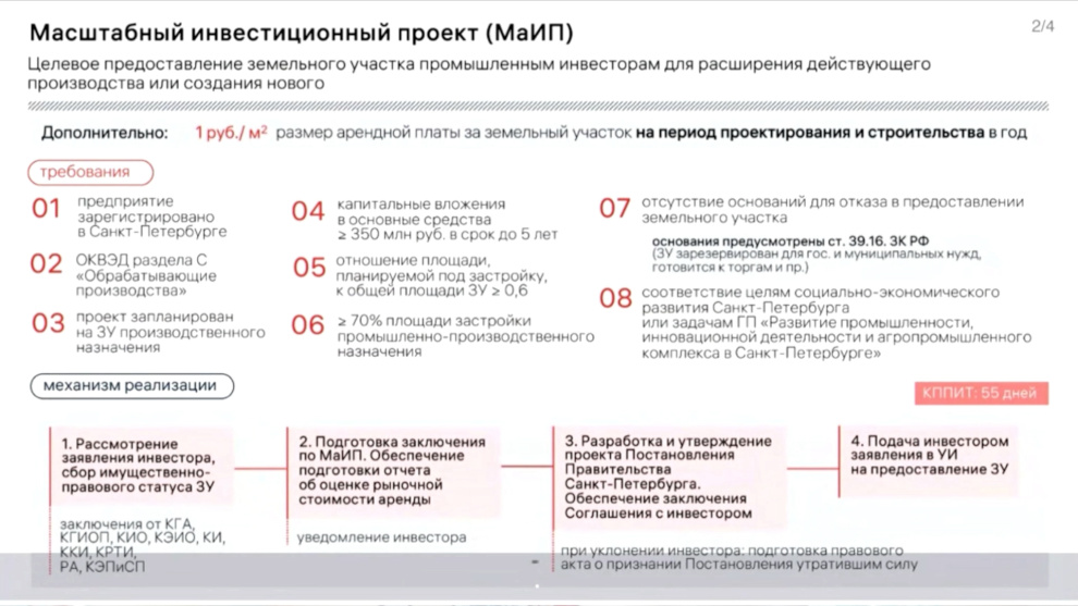 Мера поддержки будет доступна для инвесторов из Санкт‑Петербурга, реализующих на территории города проекты в сфере обрабатывающего производства. Размер инвестиций должен составлять не менее 350 млн рублей, срок реализации не должен превышать пяти лет. Ожидается, что результатом внедрения данной меры поддержки станет создание новых высокотехнологичных производств, а также появление высокопроизводительных рабочих мест.