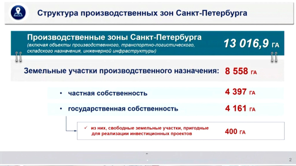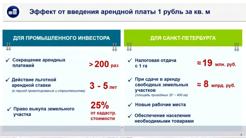 «В условиях санкций особенно важно поддержать инвесторов, которые намерены строить новые промышленные объекты. Спрос на землю с их стороны есть. В работе сейчас находятся уже порядка 10 инвестиционных проектов в различных отраслях обрабатывающей промышленности. Многие из них направлены на выпуск импортозамещающей продукции. Наша задача - поддержать эти инициативы и помочь инвесторам. Принятый документ позволит предложить весь комплекс мер как финансовой, так и нефинансовой поддержки», - сказал губернатор Александр Беглов. Он отметил, что несмотря на санкционное давление, промышленность города продолжает стабильно развиваться благодаря принятым на федеральном и городском уровне мерам поддержки. Сегодня петербургские предприятия получают займы на льготных условиях, а также налоговые преференции и вычеты.
