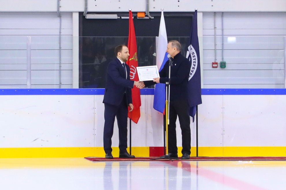 Александр Беглов принял участие в торжественном открытии новой ледовой арены спортивной школы олимпийского резерва по хоккею Динамо-юниор на улице Фаворского. Здесь будут проводиться тренировки и соревнования.