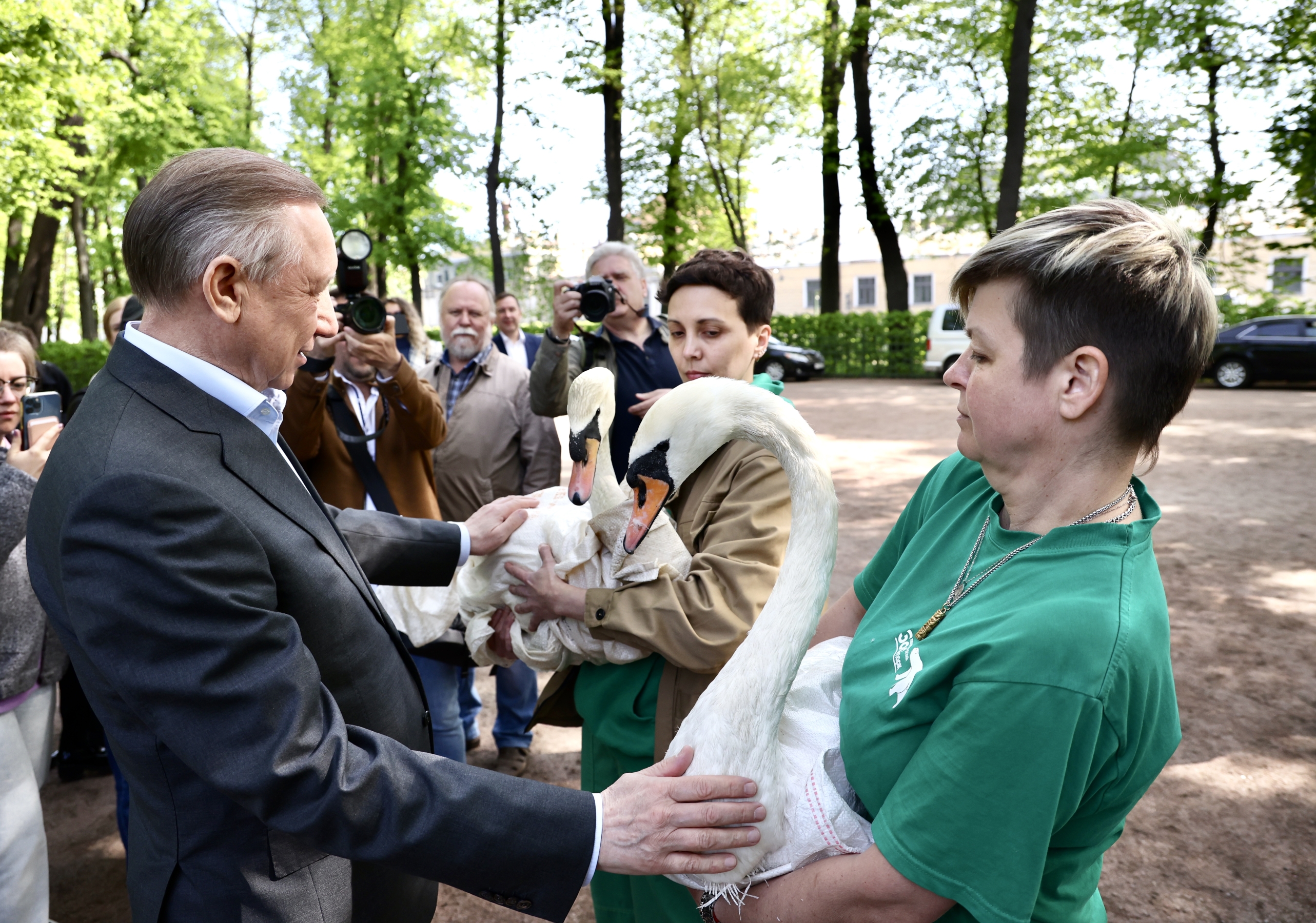«Летние «каникулы» лебедей в Летнем саду стали популярной достопримечательностью. Старейший сад Петербурга уже трудно представить без этих прекрасных птиц, символизирующих любовь и верность», - отметил глава города. Он поблагодарил специалистов Ленинградского зоопарка и Русского музея, которые ухаживают за пернатыми.