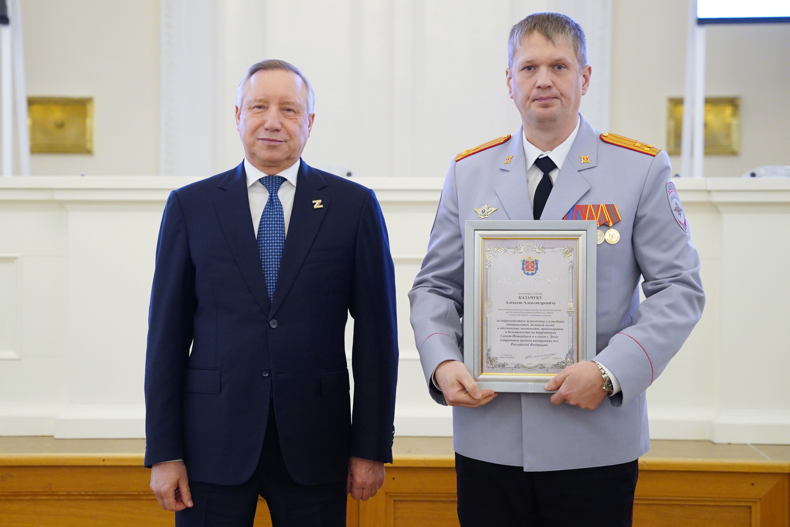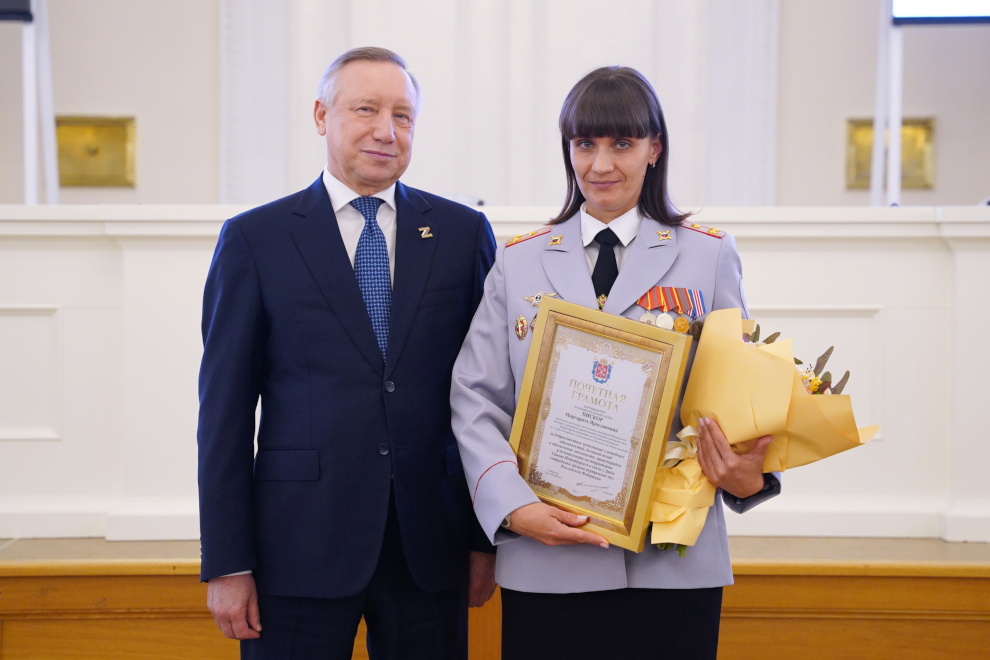 Губернатор наградил почетными грамотами и благодарностями за успехи в укреплении законности и охране правопорядка города сотрудников ГУ МВД России по Санкт‑Петербургу и Ленинградской области, Управления на транспорте МВД России по Северо-Западному Федеральному округу и учебных заведений МВД России.