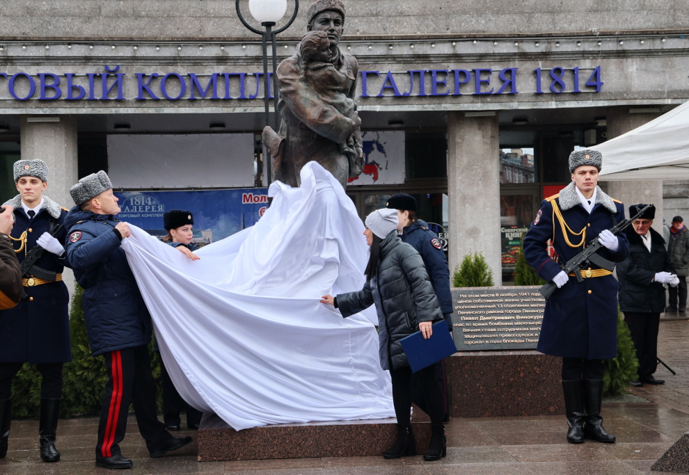 «Президент Владимир Владимирович Путин призвал с душой отметить этот священный день. По предложению ветеранов в городе уже установлены памятники блокадному учителю и блокадным медикам. По инициативе ГУВД сегодня мы открываем памятник участковому Павлу Винокурцеву и всем милиционерам, служившим в блокадном Ленинграде и оборонявшим его», – сказал он.