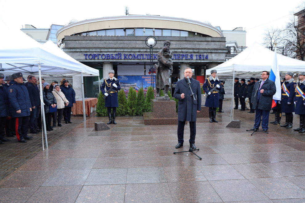 «Восьмого ноября 1941 года неподалёку отсюда, на Перекопской улице, во время бомбёжки он прикрыл собой девочку, оказавшуюся посреди улицы на трамвайных путях. Сам погиб, а девочку спас. Вечная ему память», - подчеркнул Александр Беглов.