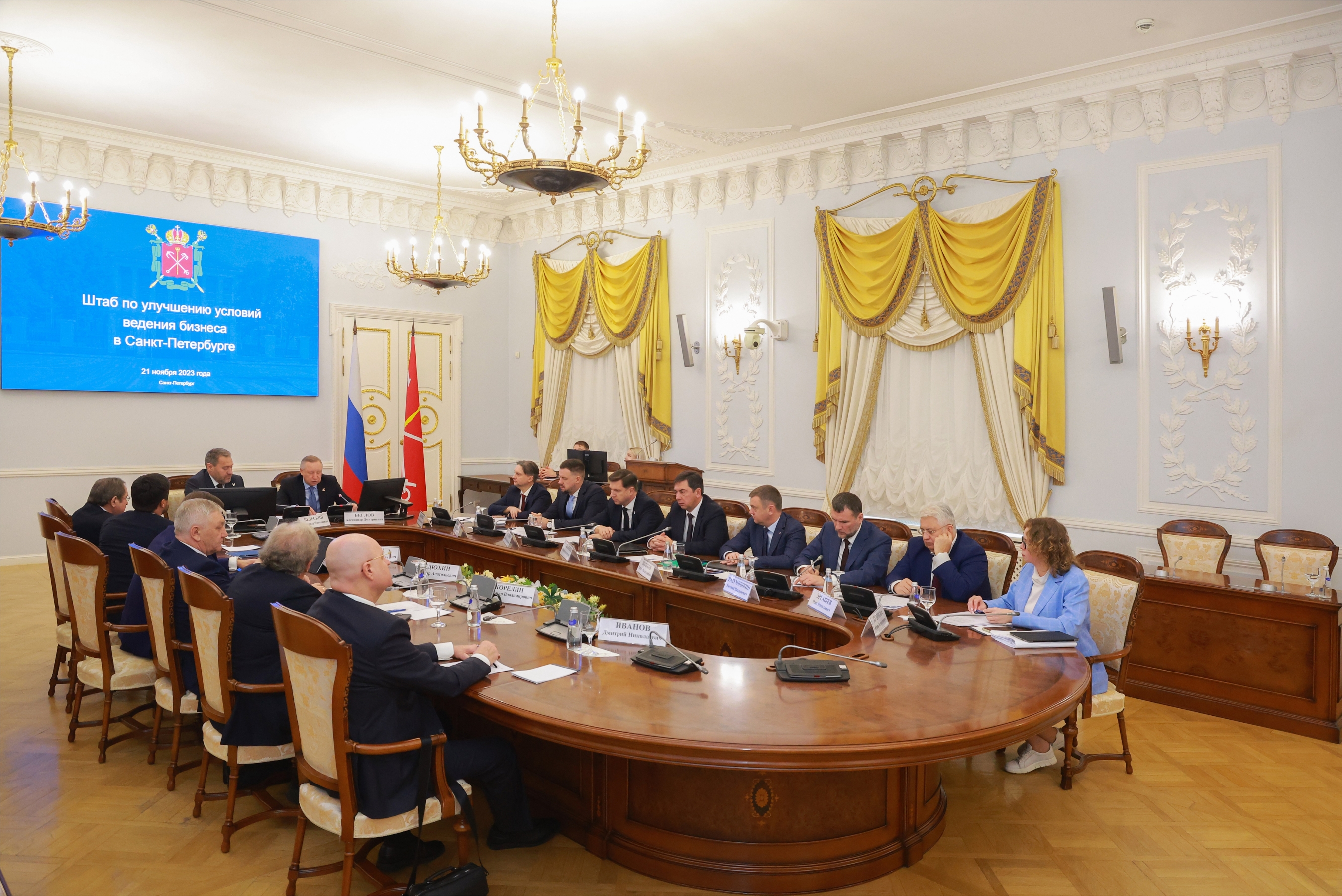 Губернатор Александр Беглов провёл заседание Штаба по улучшению условий ведения бизнеса в Санкт‑Петербурге. В нём приняли участие председатель Законодательного Собрания Санкт‑Петербурга Александр Бельский, члены городского правительства, руководители профильных комитетов, представители бизнес-сообщества. На заседании подведены итоги работы за период с октября 2022 по сентябрь 2023 года.