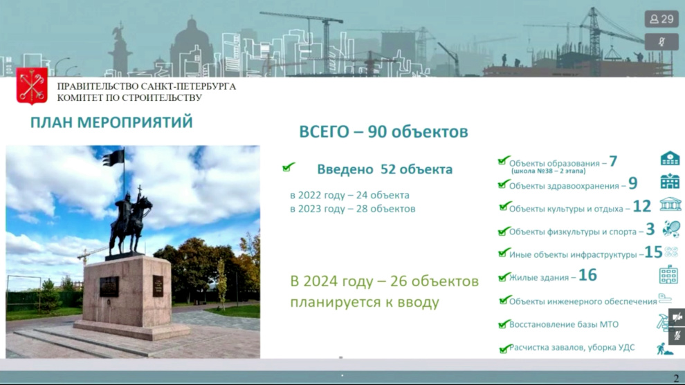 При участии петербургских строителей в 2022 году завершены работы на 24 объектах. В 2023 году восстановлено и сдано в эксплуатацию 28 объектов. Среди них - объекты здравоохранения, образования, культуры, инженерии, транспортной инфраструктуры, жилые дома, общежития, пожарные депо. В 2024 году планируется завершить работы на 24 объектах. Планы работ на 2024-2028 годы согласованы с Правительством ДНР и администрацией Мариуполя.