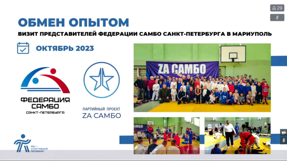 За 2022-2023 годы в Мариуполь было поставлено 9500 тысяч единиц спортивного оборудования и инвентаря. Продолжается обмен опытом - в октябре 2023 года представители петербургской Федерации самбо посетили Мариуполь, где провели серию мастер-классов и семинаров. Они передали в дар мариупольцам спортивную и судейскую форму, 120 комплектов экипировки для юных самбистов.