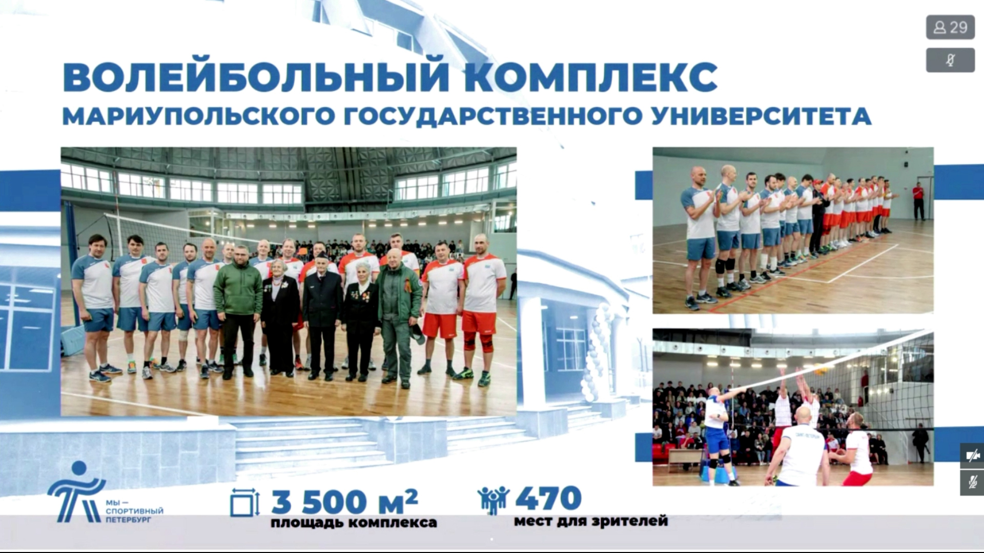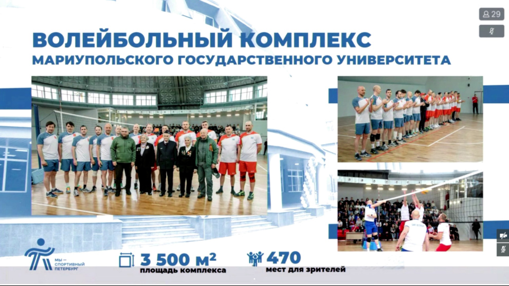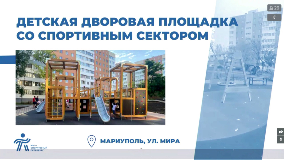 2 мая 2023 года открылся многофункциональный спортивный комплекс Мариупольского государственного университета, восстановленный петербургскими строителями. В рамках открытия состоялся товарищеский матч по волейболу между командами Правительств Санкт‑Петербурга и Мариуполя. В июле 2023 года в Мариуполе на улице Мира открылась детская дворовая площадка со спортивным сектором, построенная петербуржцами в соответствии со всеми современными стандартами и требованиями.