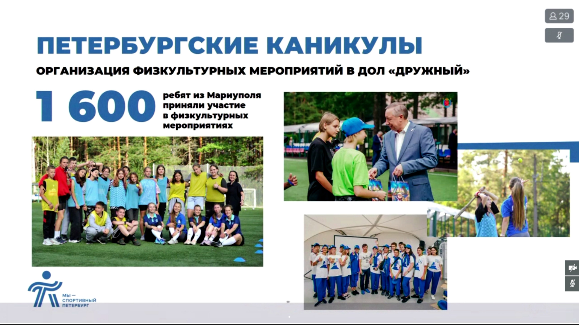 1700 мариупольцев приняли участие в 20 физкультурных и спортивных мероприятиях в Петербурге в 2022-2023 годах. Проводится работа по организации спортивного досуга мариупольских ребят, которые приезжают отдыхать на каникулы в лагерь «Дружный». 1600 детей в рамках 4 смен приняли участие в физкультурных мероприятиях «Петербургские каникулы» по футболу, волейболу, городошному спорту, айкидо и другим видам. Были организованы мастер-классы и встречи с именитыми петербургскими спортсменами.