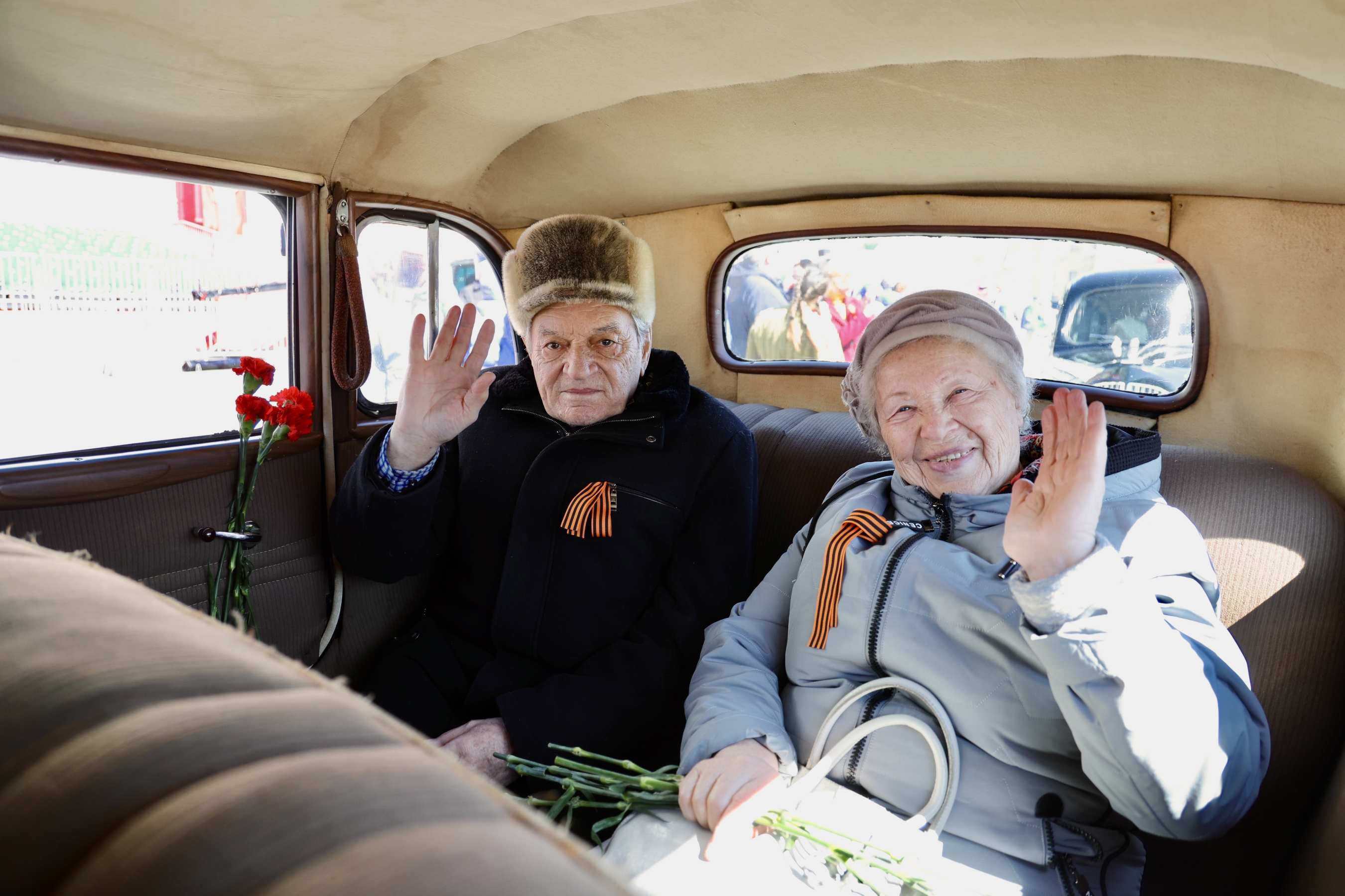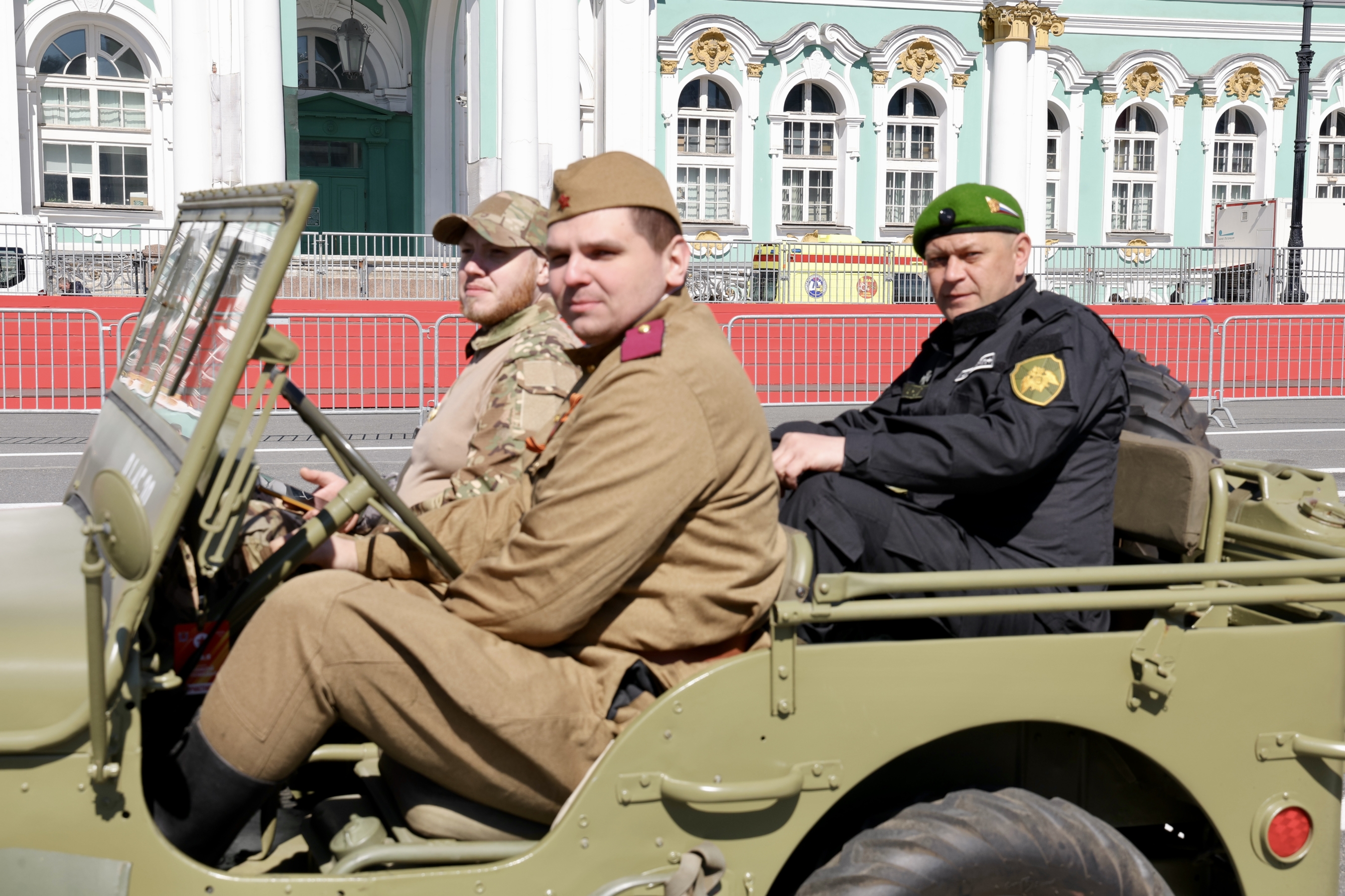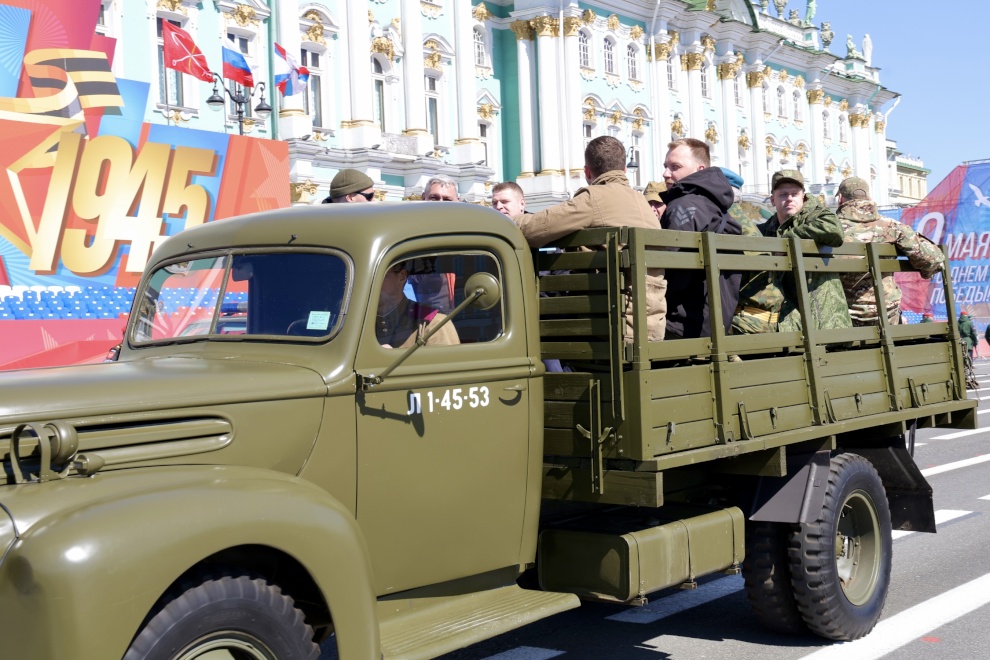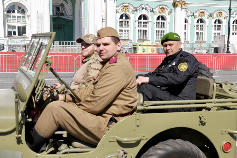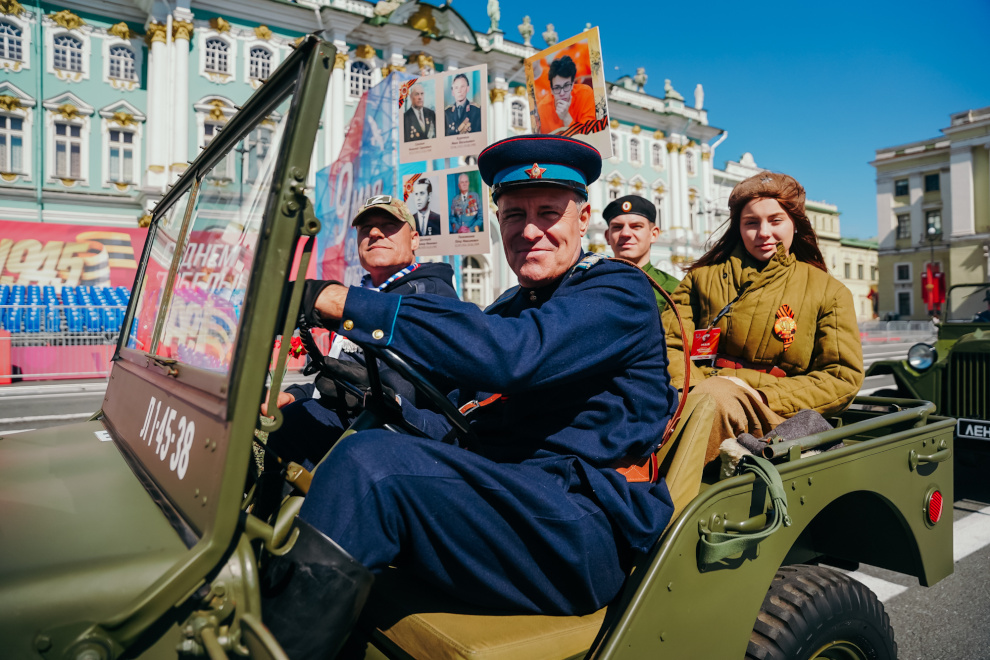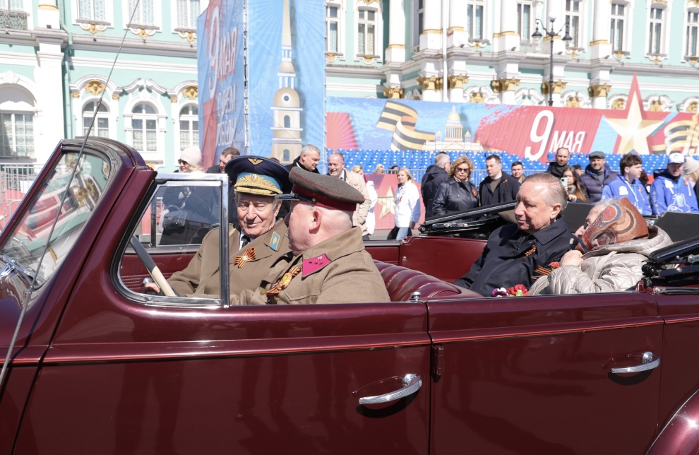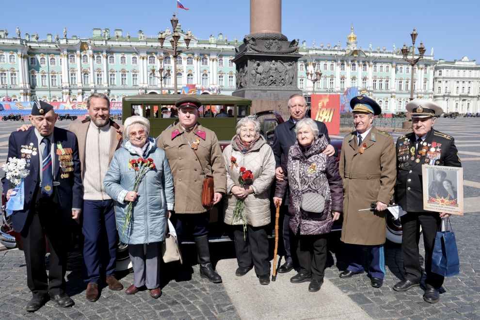 20 ветеранов Великой Отечественной и 130 ветеранов СВО, проехав по Невскому проспекту, вернулись на Дворцовую площадь, чтобы стать зрителями праздничного концерта на главной площади города. А участвовавшие в торжественном проезде ретро-автомобили разместили на специальной площадке на площади для того, чтобы с ними могли поближе познакомиться петербуржцы и гости города.