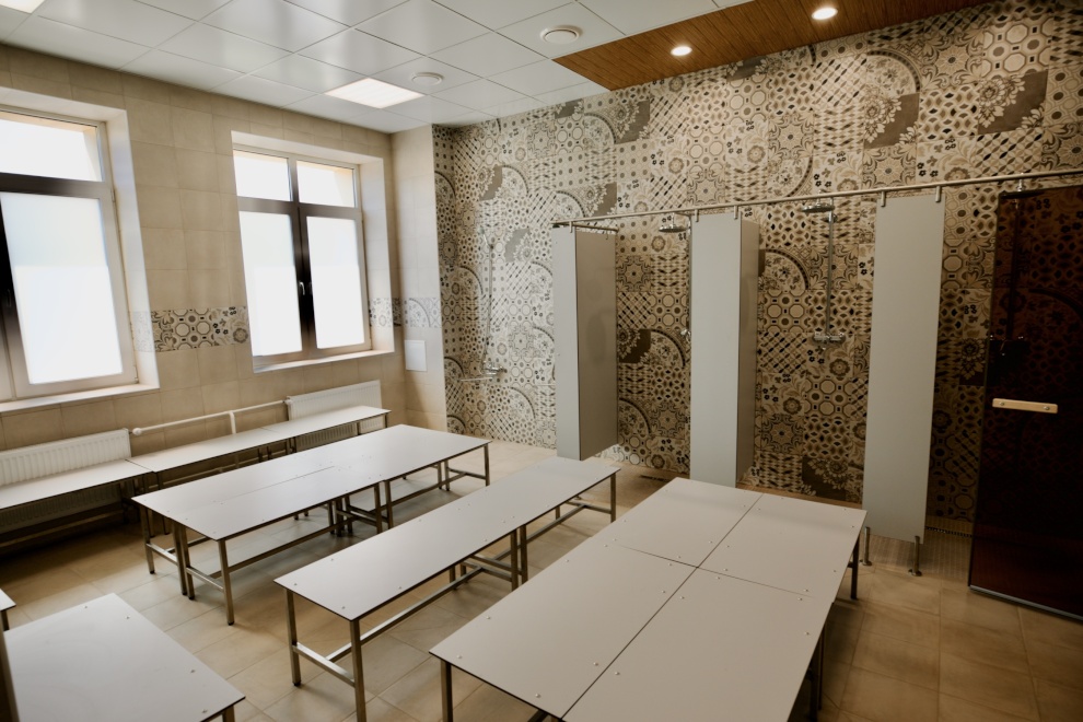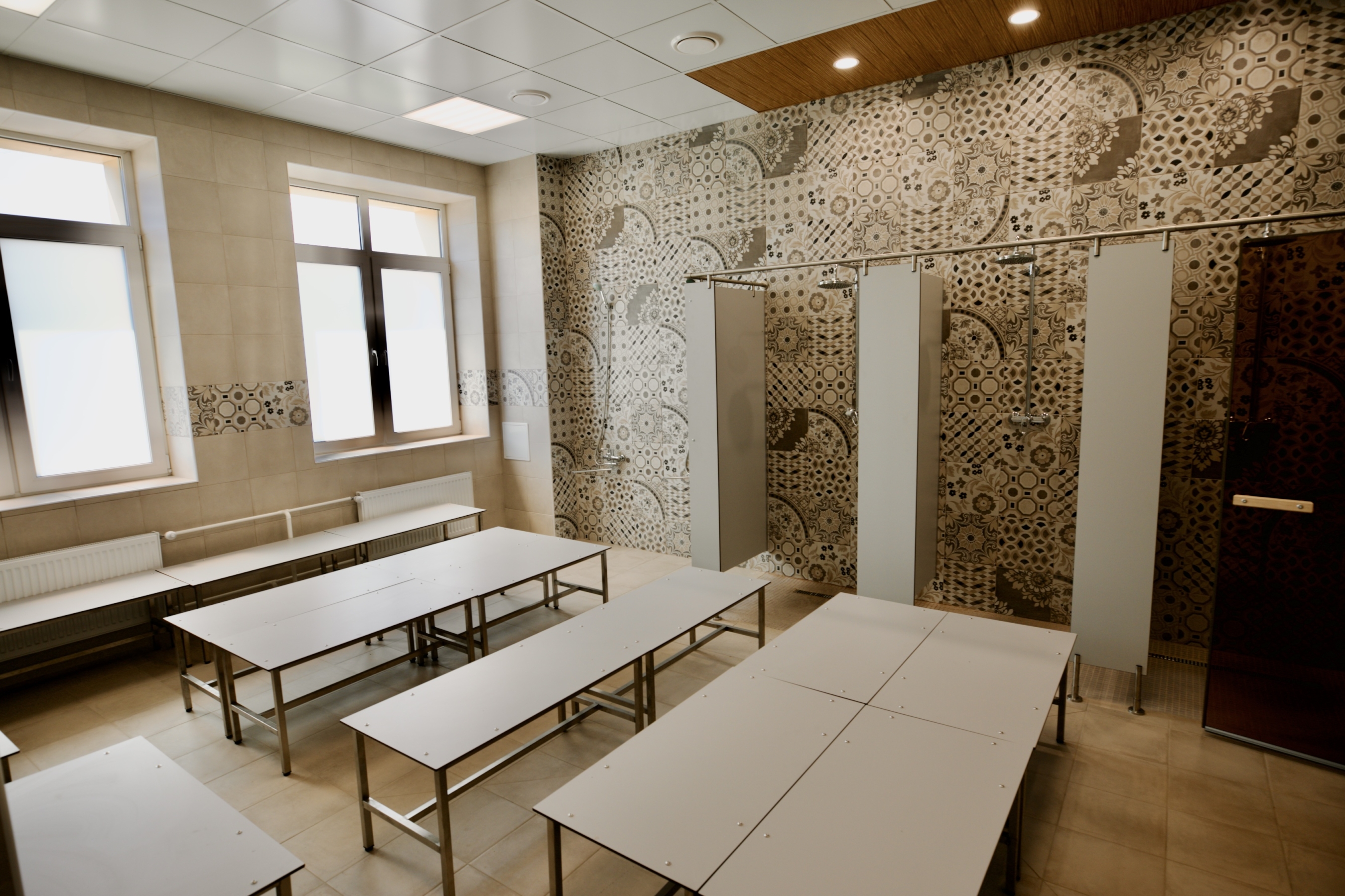 Также благодаря строителям из Северной столицы в Мариуполе появилась первая стационарная баня. В ней 4 отделения, каждое из которых имеет свою парилку. Есть буфет и парикмахерская.