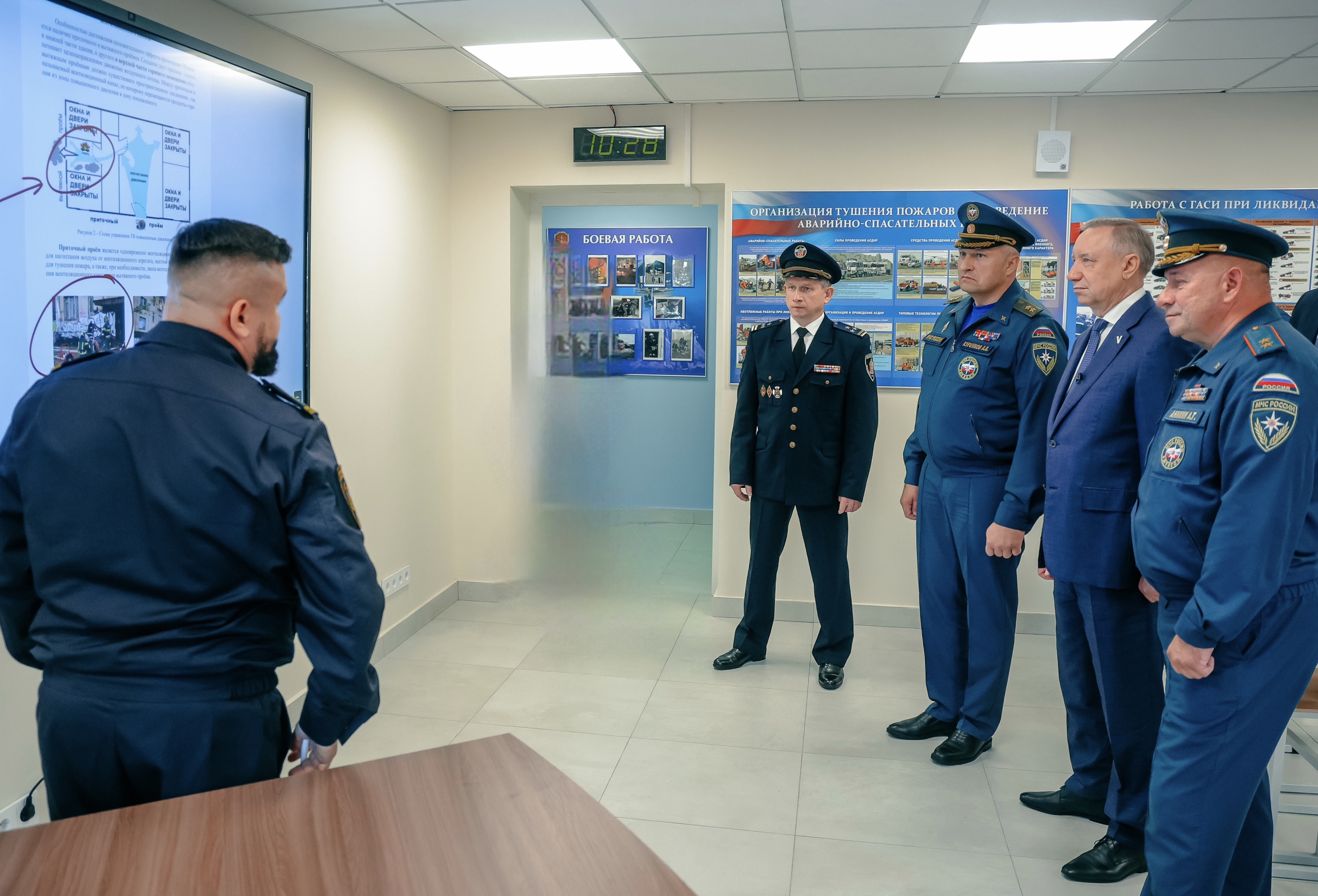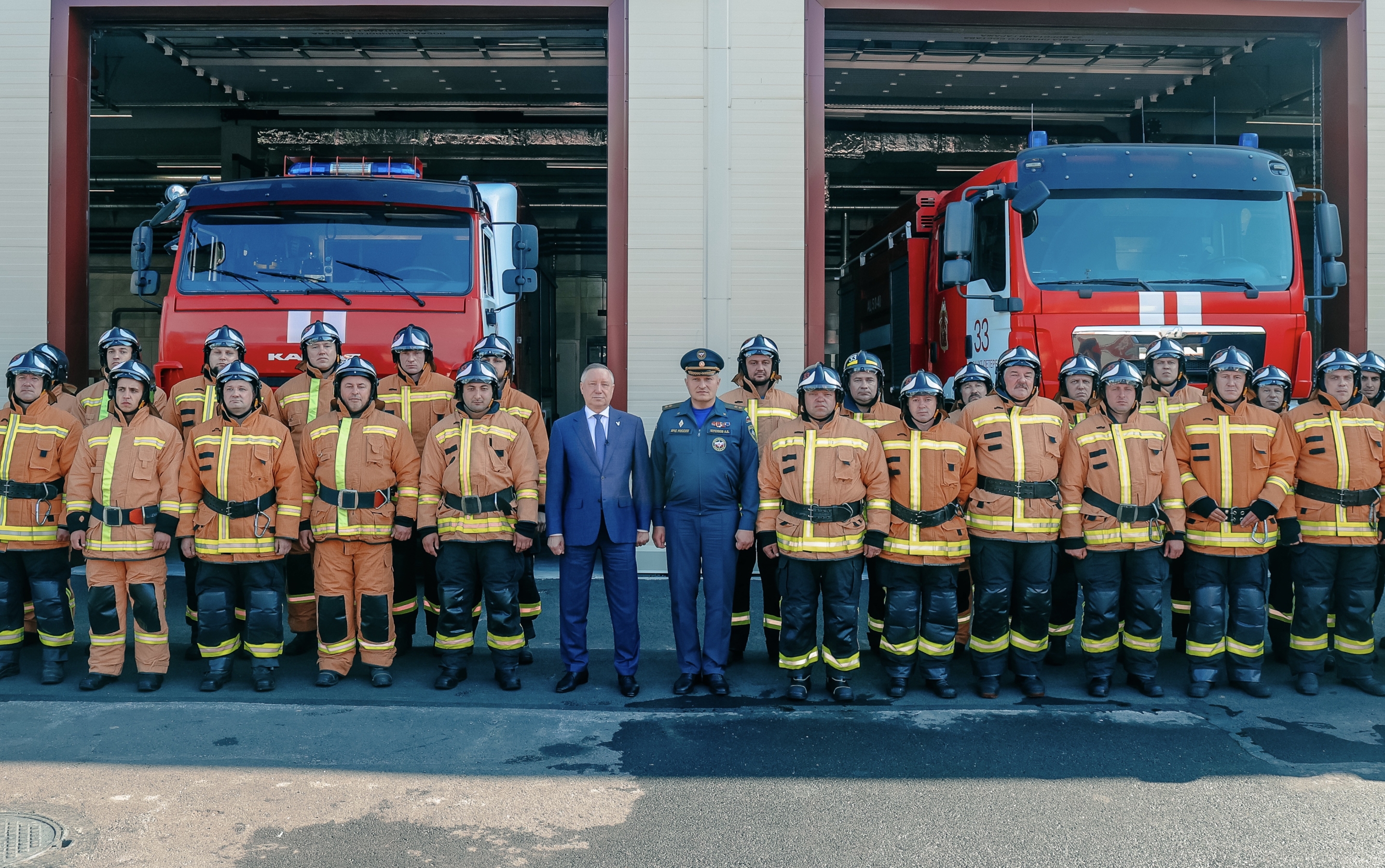 Губернатор Александр Беглов и министр РФ по делам гражданской обороны, чрезвычайным ситуациям и ликвидации последствий стихийных бедствий Александр Куренков приняли участие в торжественной церемонии открытия пожарно-спасательной части №33 в Красном Селе.