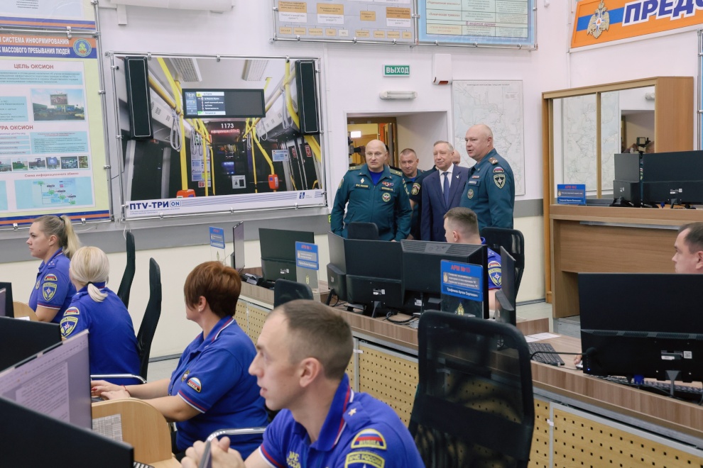 Губернатор Александр Беглов и министр РФ по делам гражданской обороны, чрезвычайным ситуациям и ликвидации последствий стихийных бедствий Александр Куренков обсудили вопросы дальнейшего обеспечения безопасности Петербурга на совещании в Городском мониторинговом центре - основном звене системы безопасности Северной столицы.