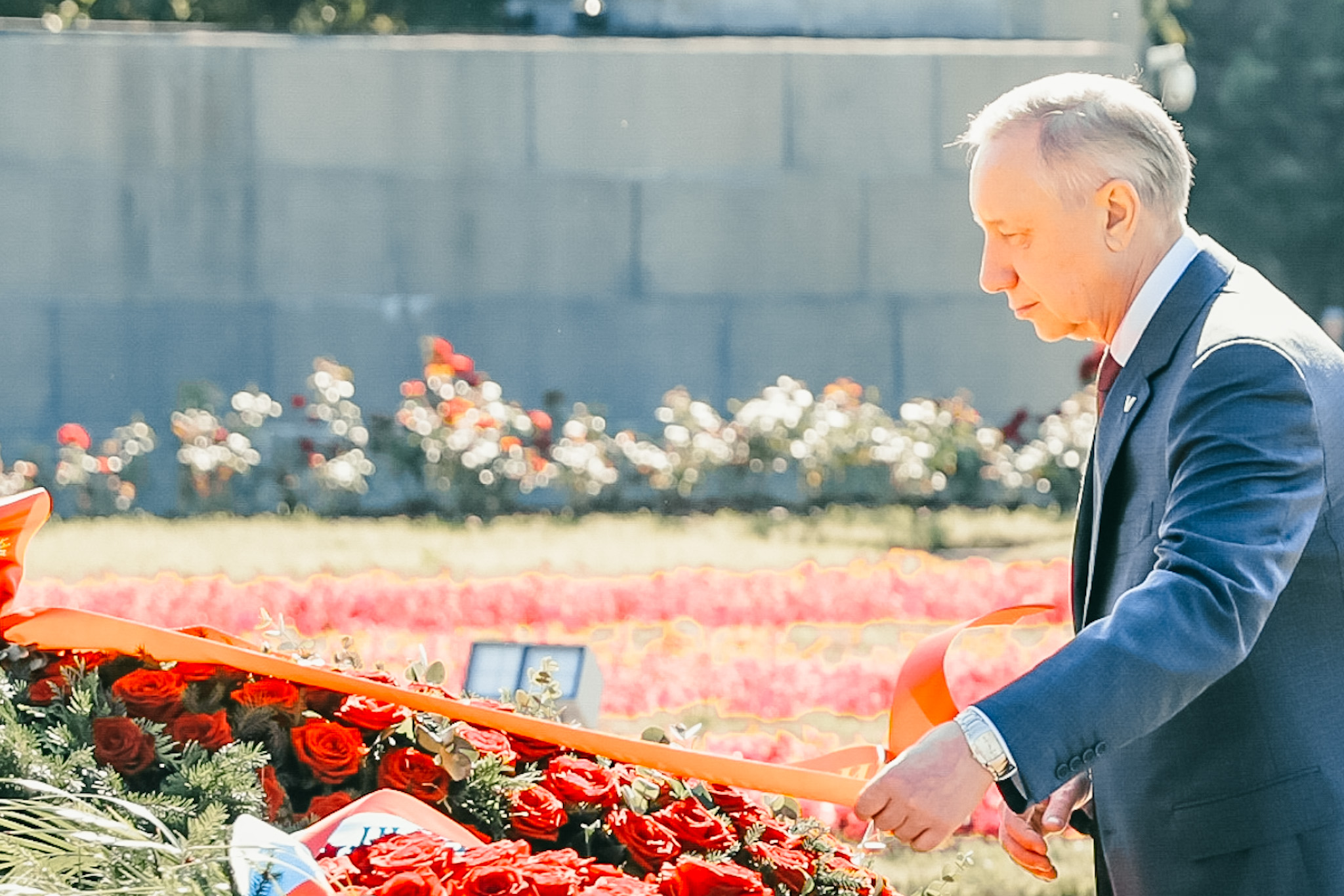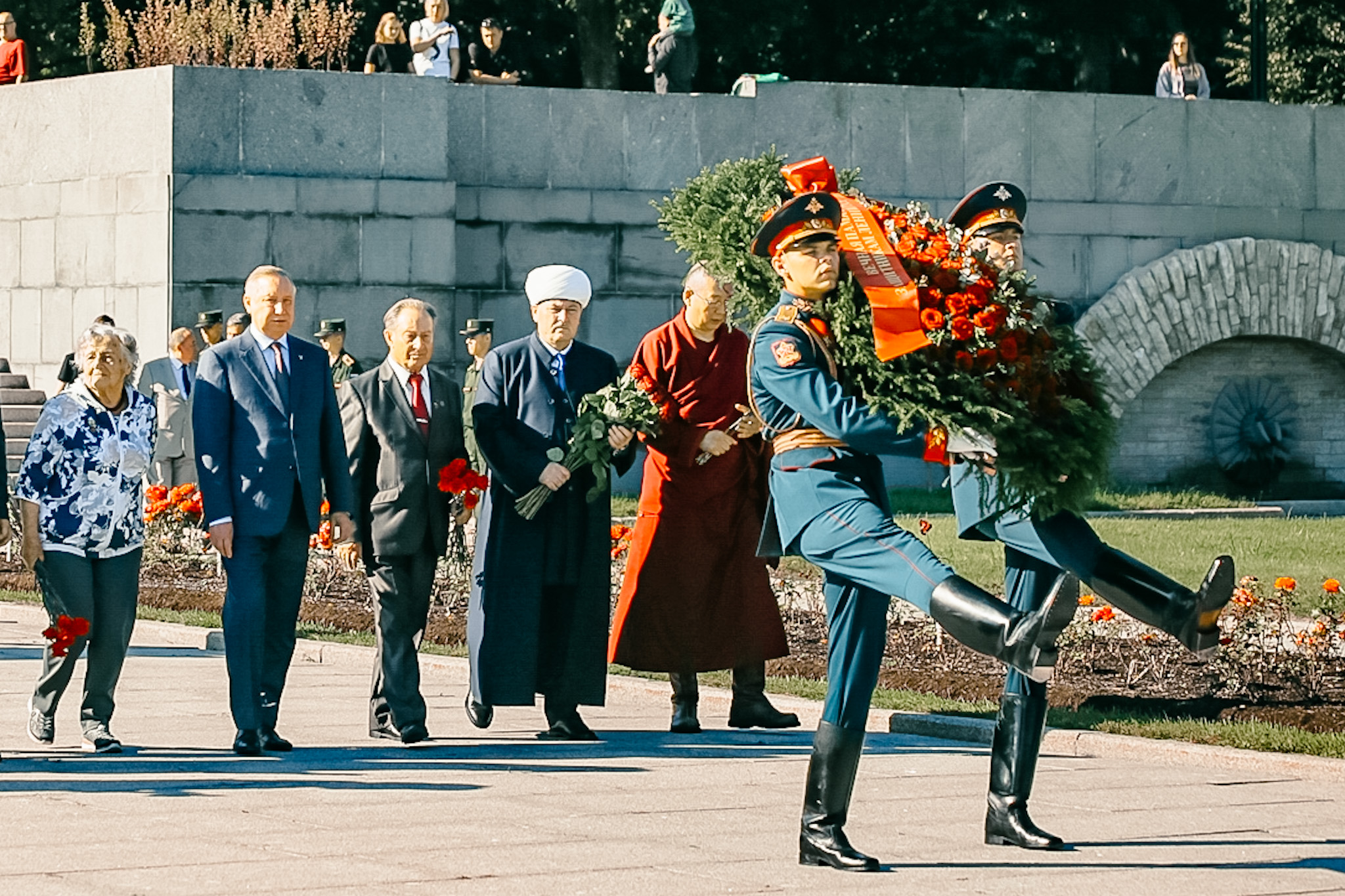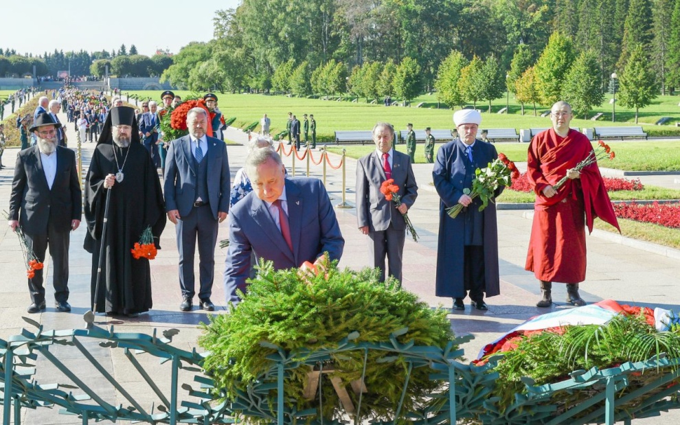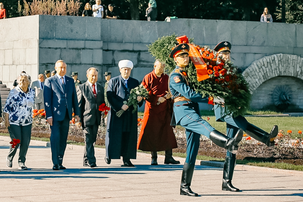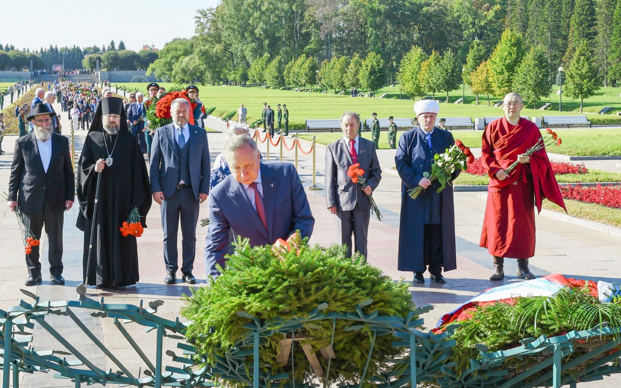 Венки от имени жителей Санкт‑Петербурга возложили губернатор Санкт‑Петербурга Александр Беглов и члены правительства Санкт‑Петербурга, председатель Законодательного Собрания Санкт‑Петербурга Александр Бельский и депутаты, председатель правления Санкт‑Петербургской общественной организации «Жители блокадного Ленинграда» Елена Тихомирова, председатель Санкт‑Петербургской общественной организации ветеранов (пенсионеров, инвалидов) войны, труда, Вооруженных Сил и правоохранительных органов Василий Волобуев, епископ Кронштадстский, наместник Свято-Троицкой Александро-Невской Лавры Вениамин, председатель Духовного Управления мусульман Санкт‑Петербурга и Северо-Западного региона России, настоятель Санкт‑Петербургской соборной мечети муфтий Равиль Панчеев, главный раввин Санкт‑Петербургской еврейской религиозной общины Менахем Певзнер, заместитель настоятеля дацана "Гунзэчойнэй" Чингис Охинов.