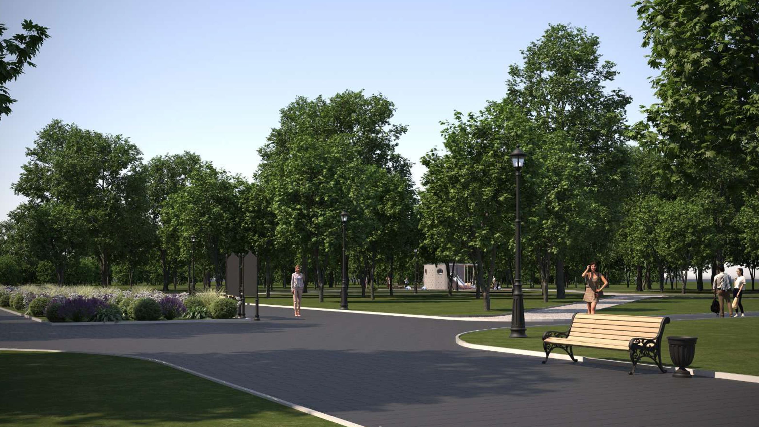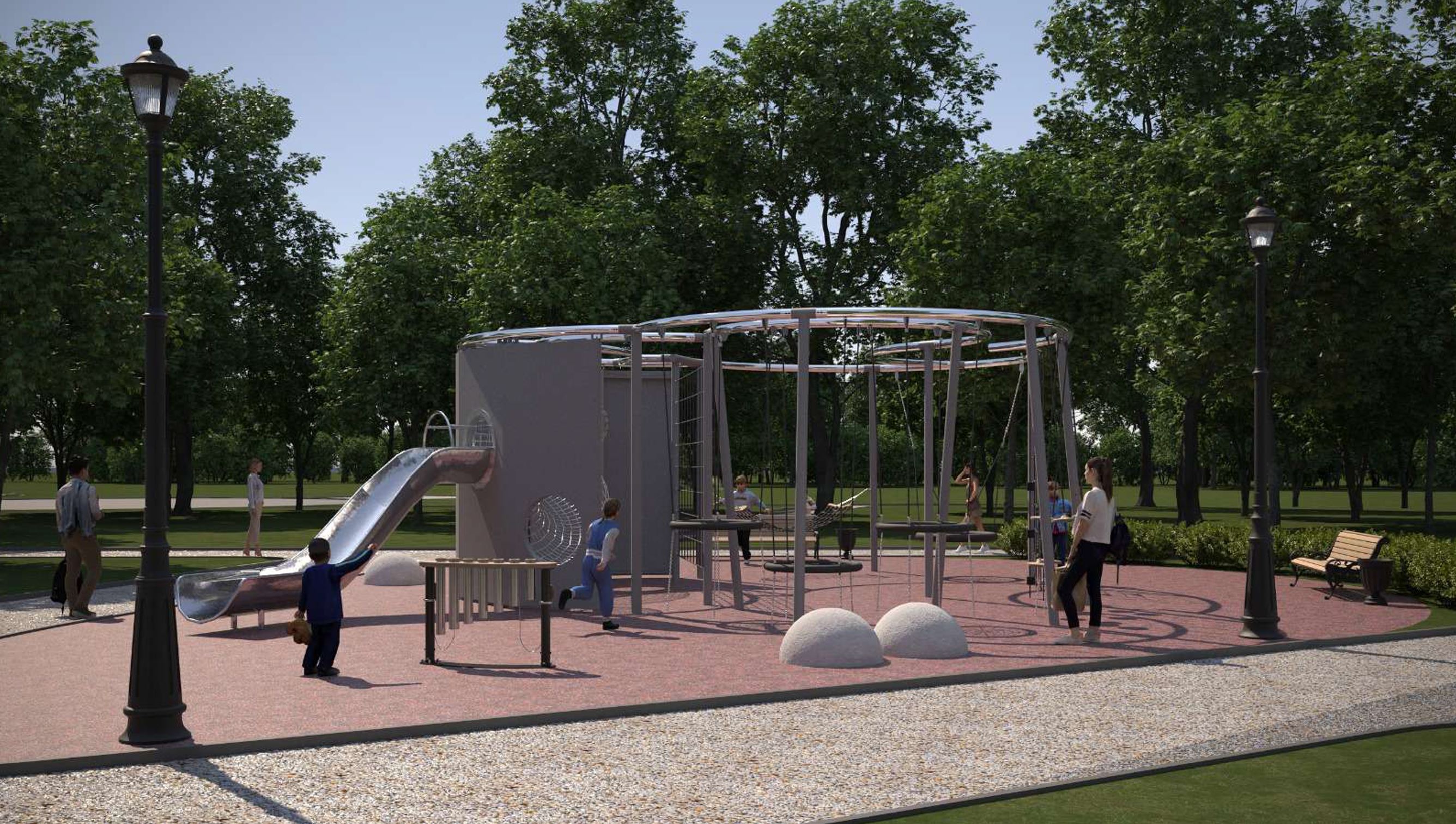 В сквере планируется устройство покрытий пешеходных дорожек, оборудование детской площадки качелями-гнездами, гамаком, канатными балансирами, сетями для лазания, горкой. Также здесь установят уличную мебель, информационный стенд, отремонтируют металлическое ограждение, проведут озеленение. Из современного оборудования появятся музыкальный инструмент из древесины (вибрафон) и интерактивная панель.