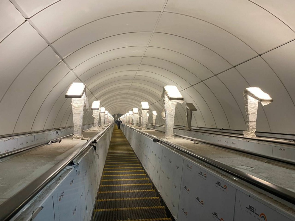 На станции метро «Юго-Западная» завершена отделка кассового зала природным камнем и смонтировано стеклянное панно над эскалаторами. Установлены сами эскалаторы, а также их балюстрады, на которых метростроители уже разместили светильники.