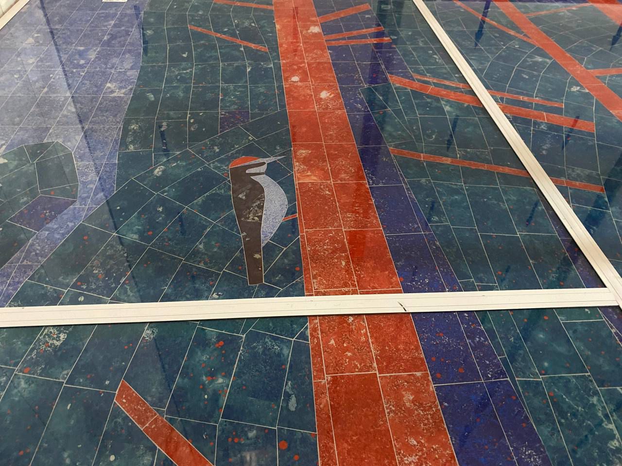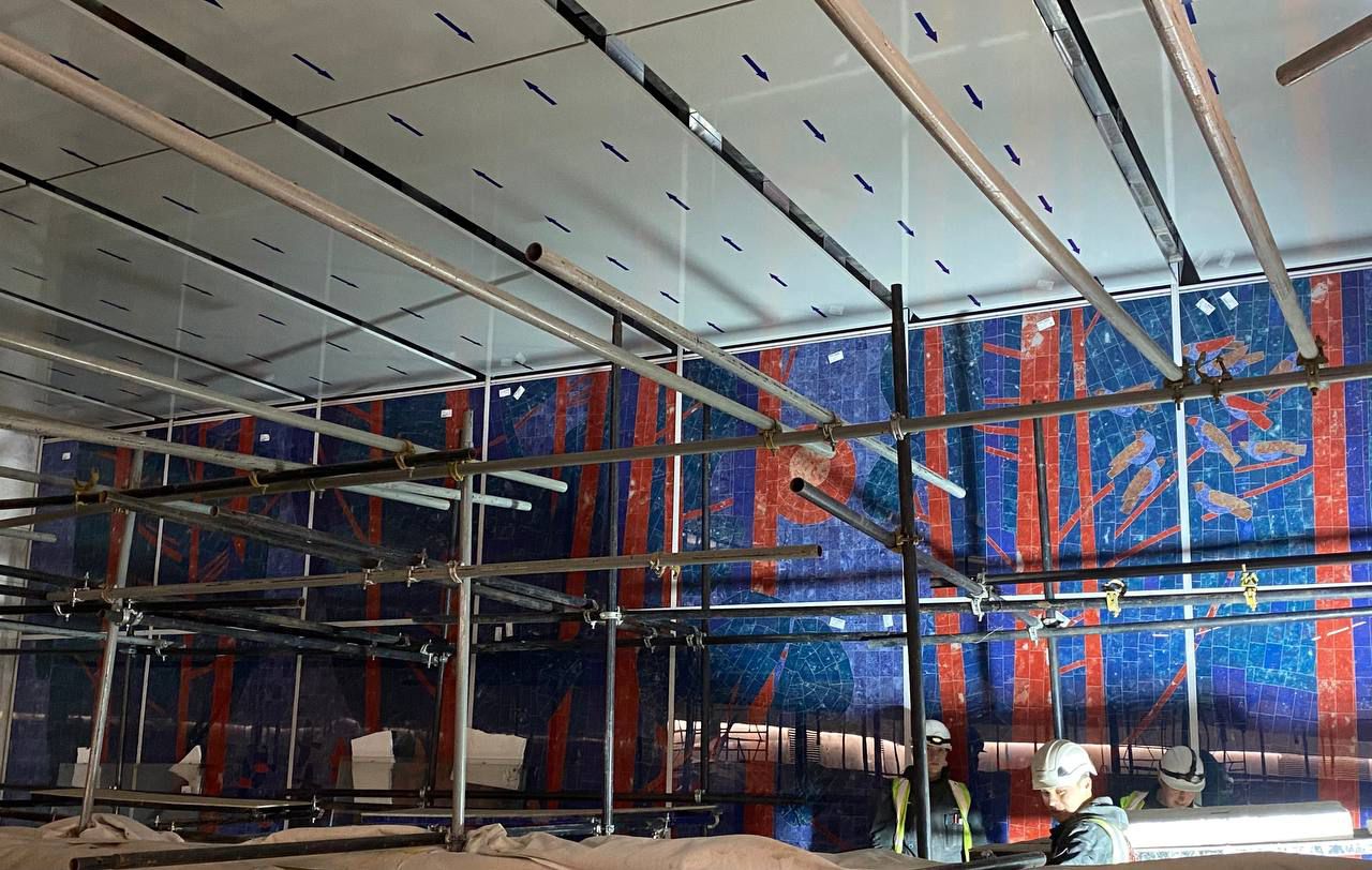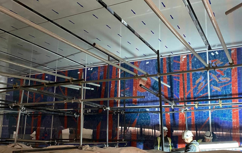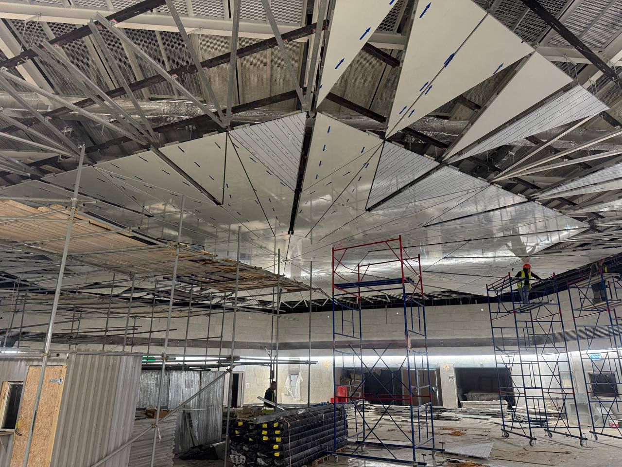 В общей сложности использовано 64 тонны металлических ферм перекрытия над кассовым залом. На эти конструкции крепится декоративный потолок – по проекту его дополняют тонкими светильниками, расходящимися от центра к граням внутреннего пространства. Размещена навигация для будущих пассажиров.