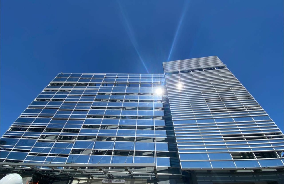 Практически готов внешний контур шестиэтажного здания. Завершены монтаж металлоконструкций и остекления фальш-фасада, вентилируемого фасада, окон и дверей типа «Метро».