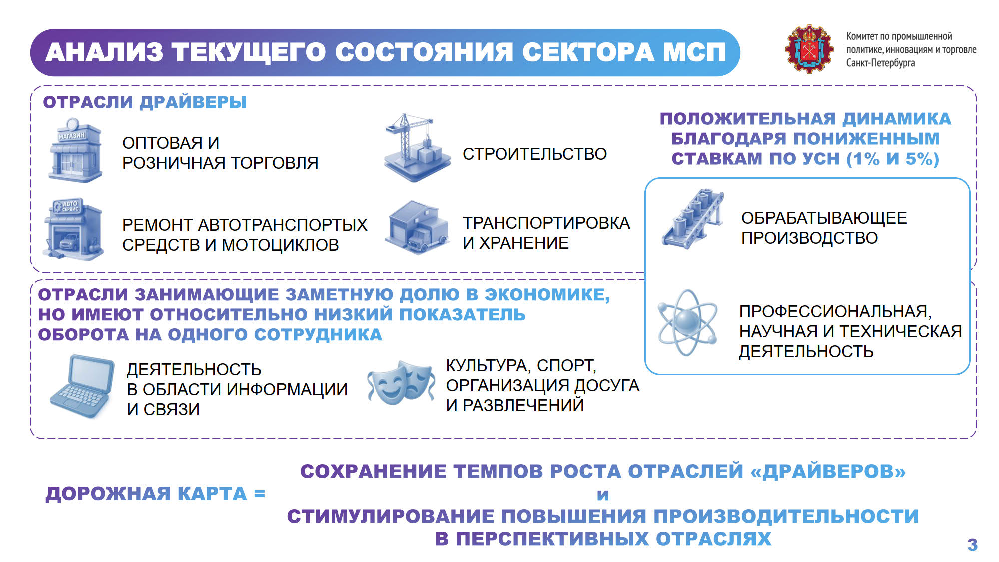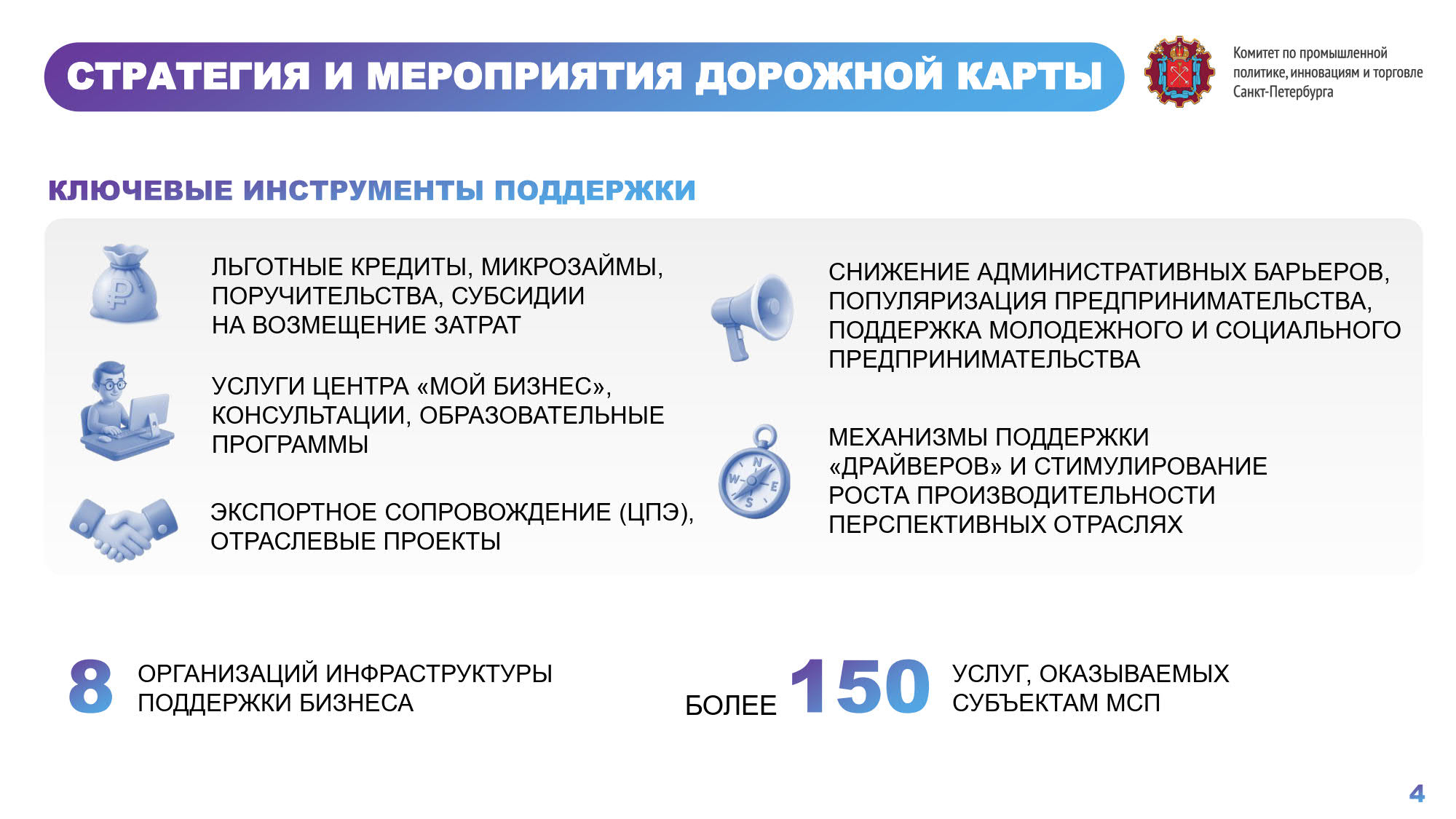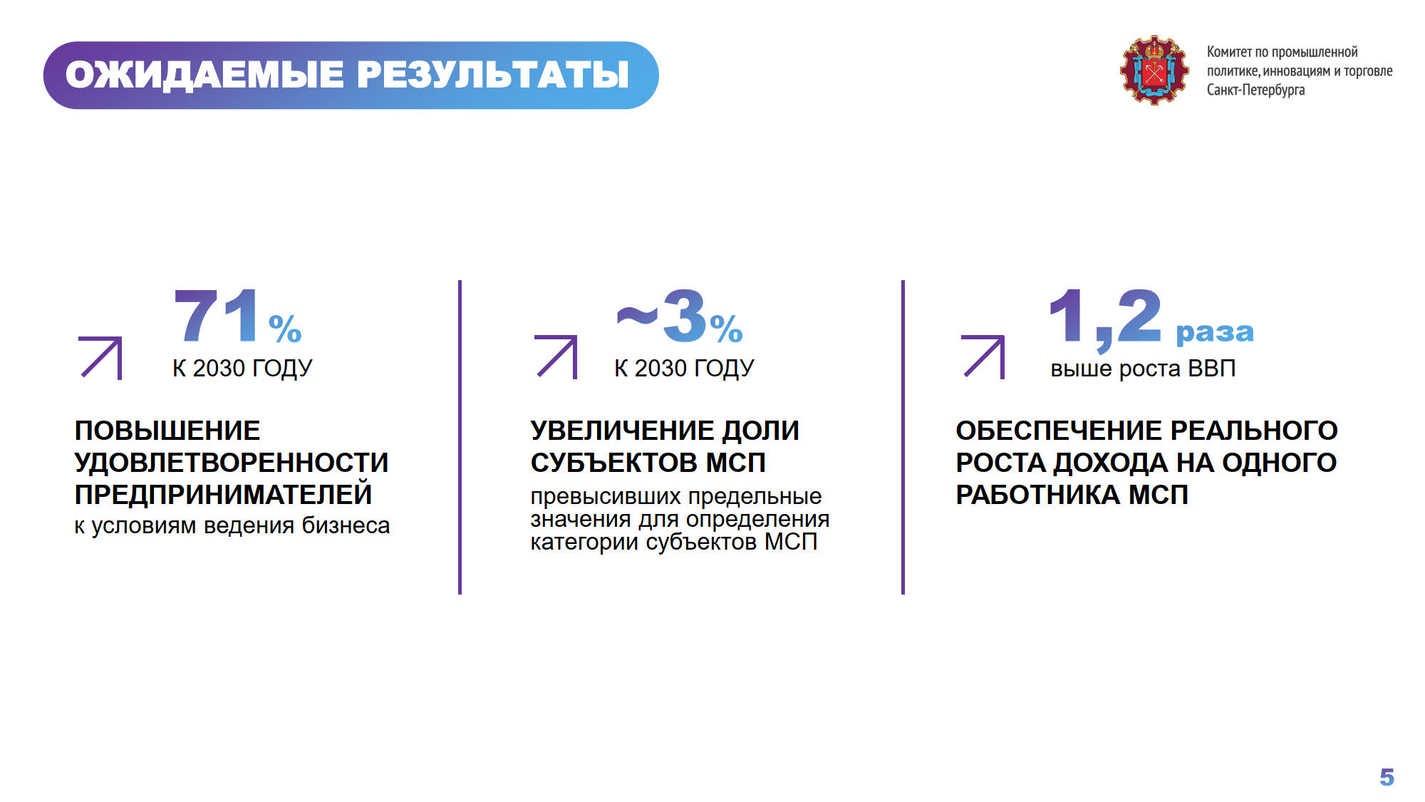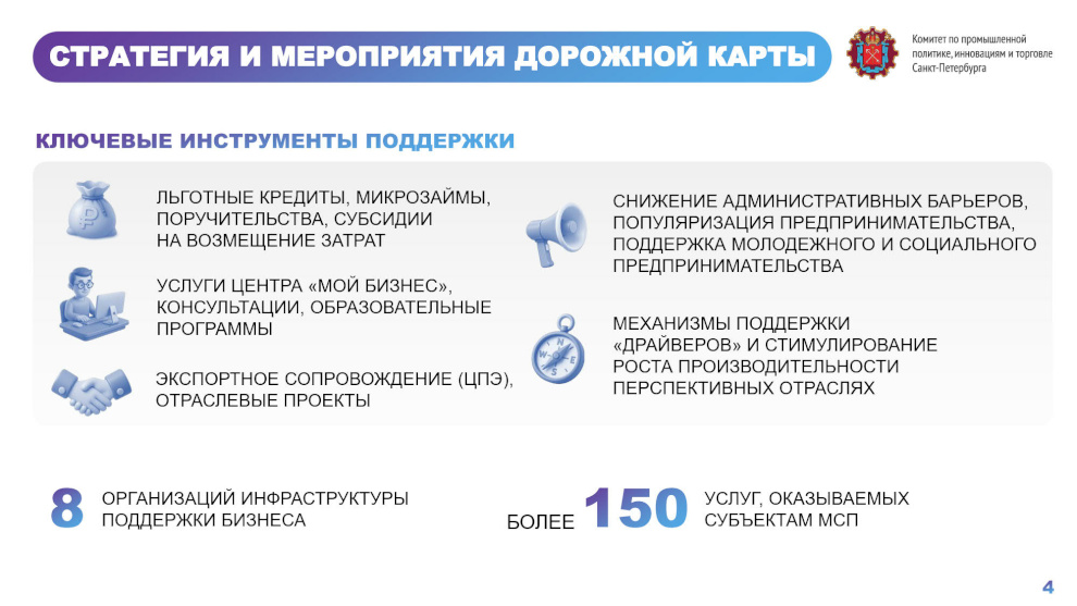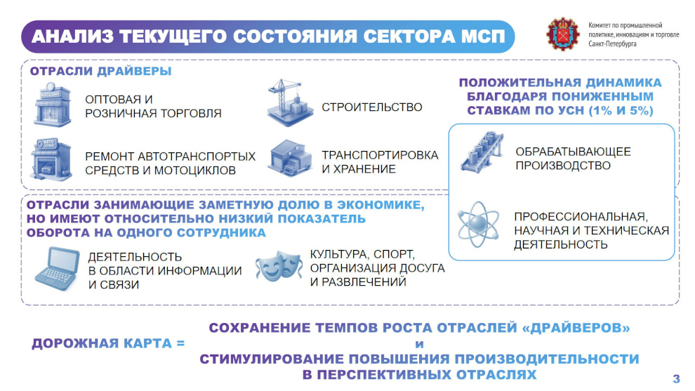 Рост целевого показателя в Петербурге обеспечивается за счёт расширения финансовых мер поддержки, в контур которых входят льготные кредиты, микрозаймы, субсидии. Малому и среднему бизнесу доступны более 150 видов услуг. Город занимает второе место в стране по развитию креативных индустрий и их вкладу в валовой региональный продукт. Доля таких индустрий в структуре ВРП - 4,6 %, тогда как средний показатель по стране - 3,9%. Задача – к 2030 году увеличить его до 6%.