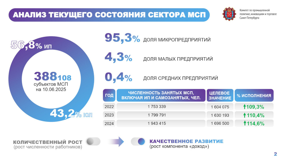 Глава города подчеркнул, что достижение показателя имеет важное значение как для развития экономики, так и для повышения благосостояния граждан. В 2024 году завершилась реализация национального проекта «Малое и среднее предпринимательство и поддержка индивидуальной предпринимательской инициативы», целью которого было увеличение числа занятых в малом и среднем бизнесе, а также самозанятых. Петербург перевыполнил этот показатель на 14,6%. В этом году стартовал новый национальный проект «Эффективная и конкурентная экономика».