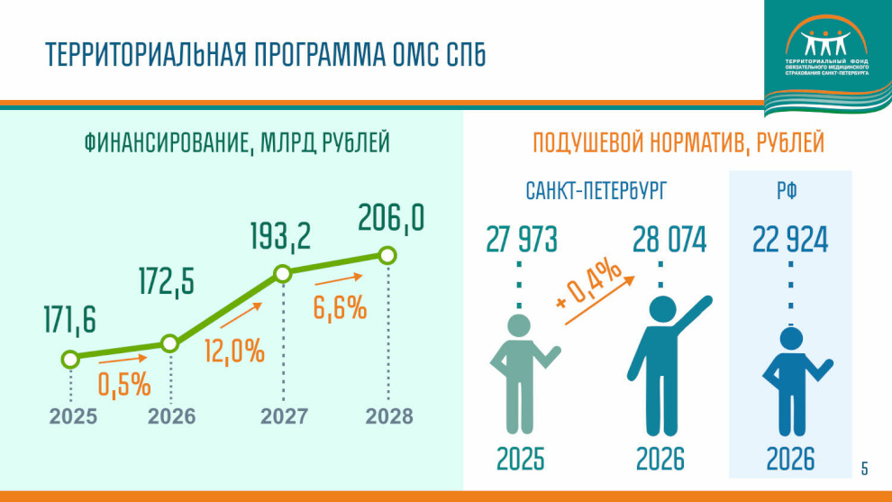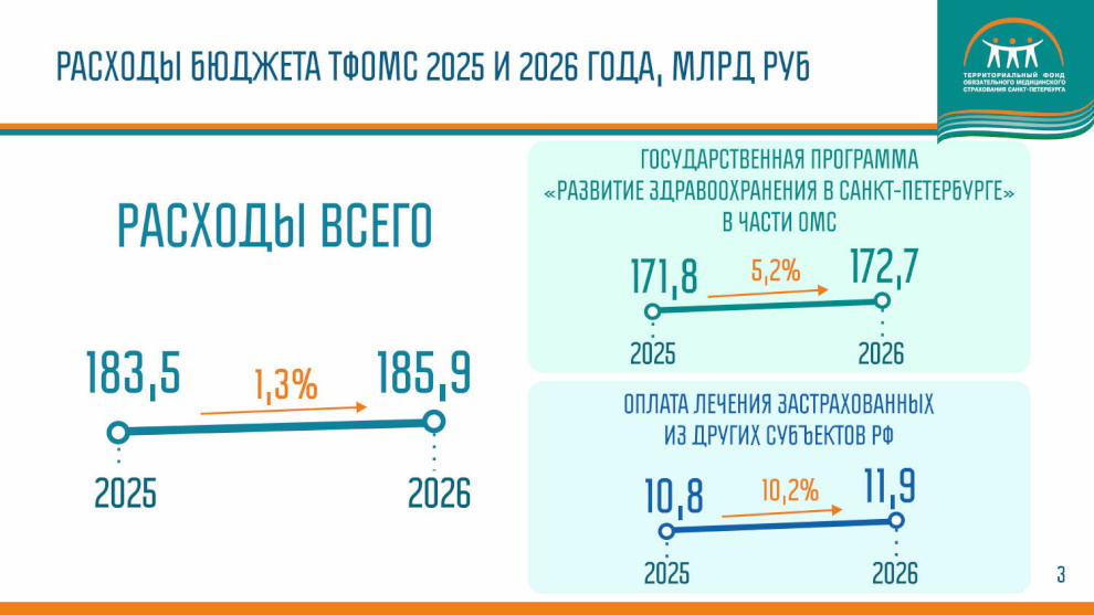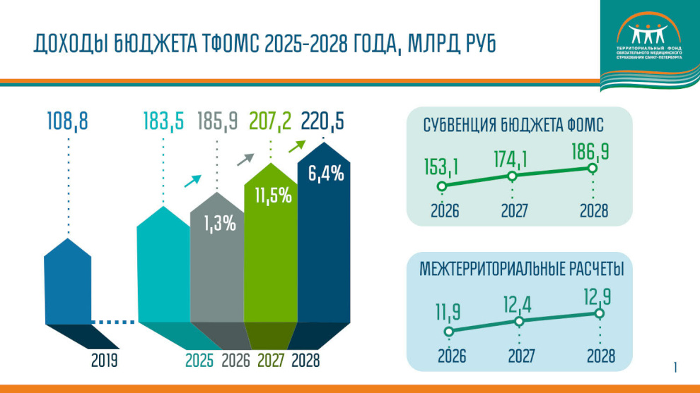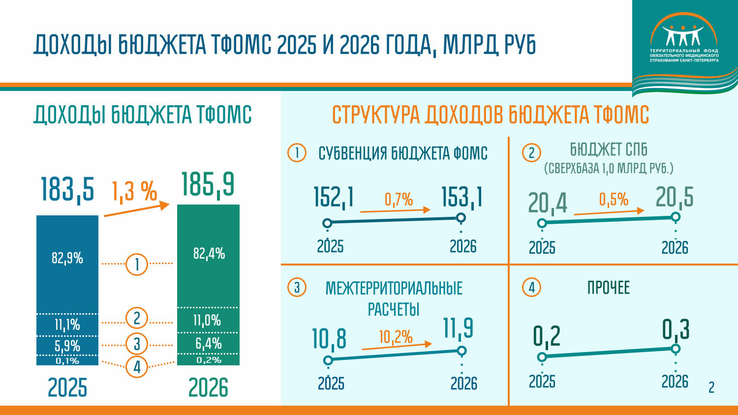 Доходная часть бюджета Территориального фонда ОМС Санкт‑Петербурга на 2026 год увеличивается по сравнению с 2025 годом на 1,3% и составит 185,9 млрд рублей. Планируется, что в 2027 году бюджет фонда составит порядка 207 млрд рублей, в 2028 году – более 220 млрд рублей.